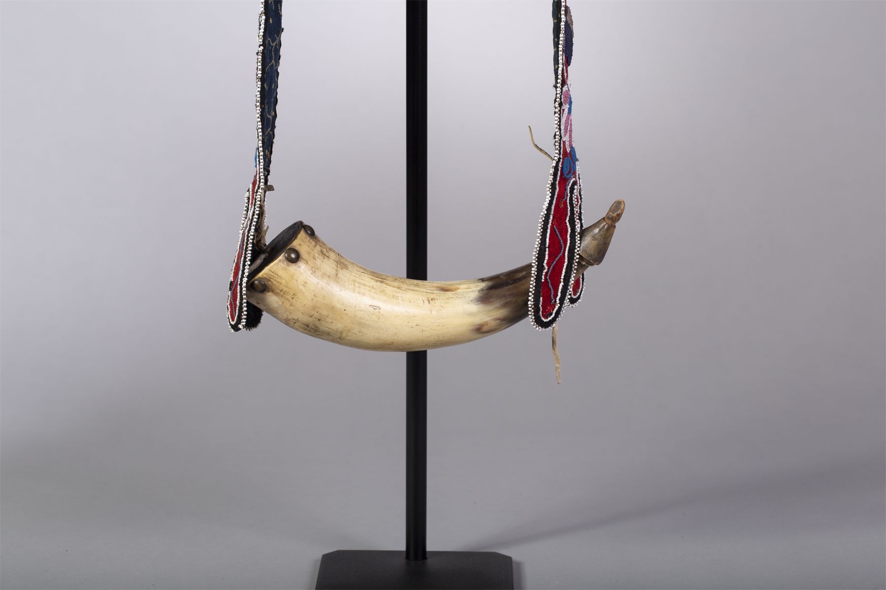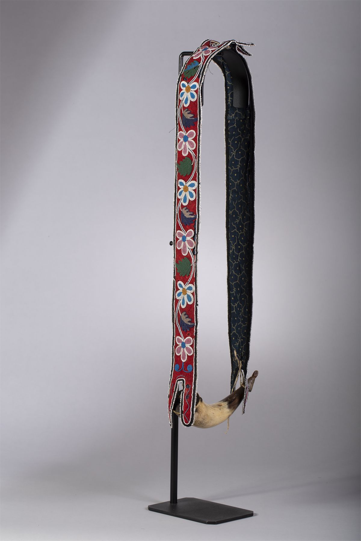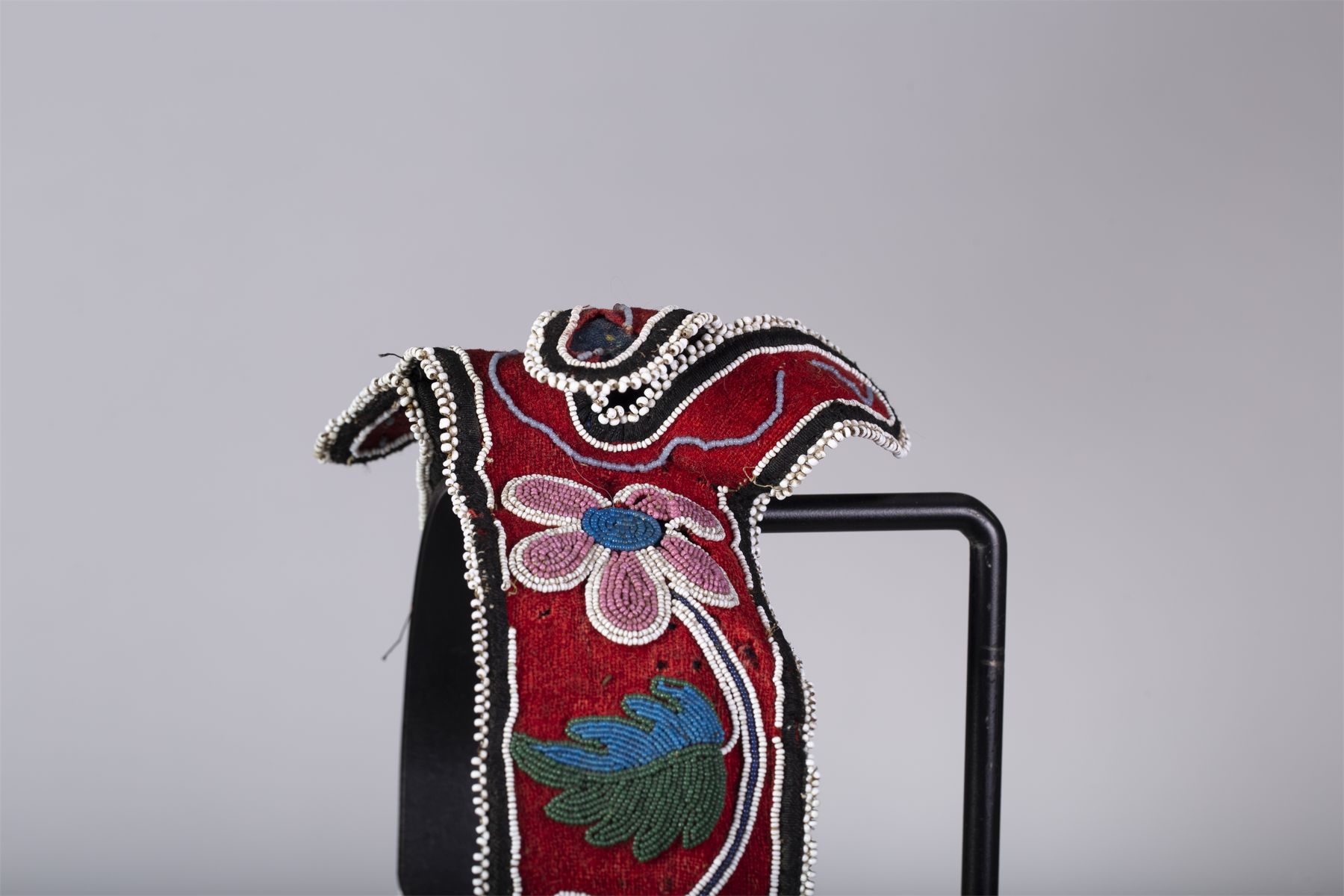 Thread sewn red trade wool with navy trim and backed with navy trade cloth. Beaded abstract floral design in colors of white, green, aqua blue, translucent periwinkle and pink straps with tacked powder horn.