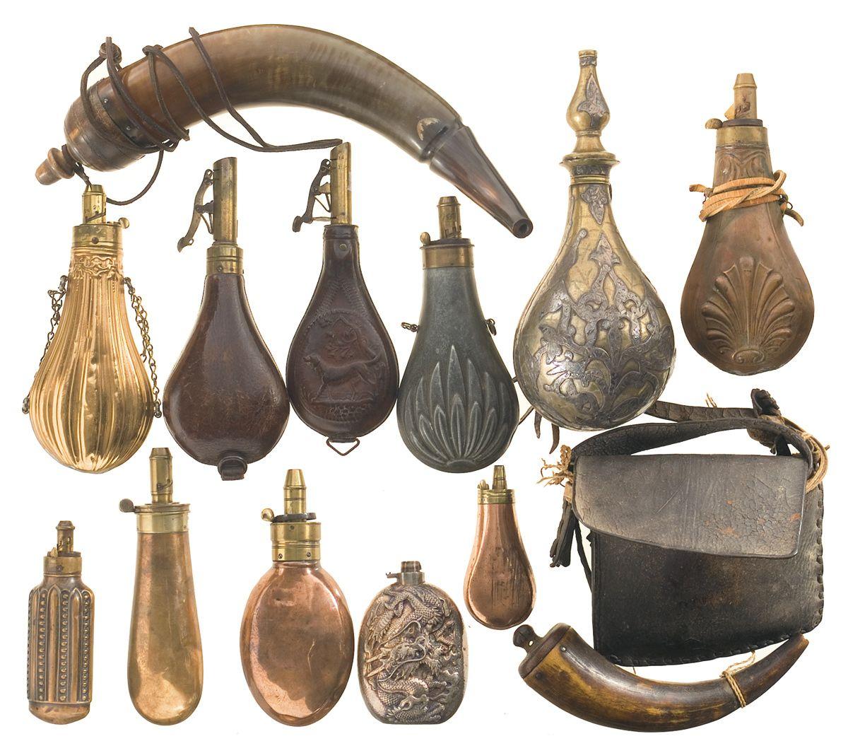 2 powder horns (one with leather pouch holding 2 percussion cap tins, bullet mold), 3 shot bags, 9 powder flasks, Flask are very good with some minor dings with a few having a couple dents.