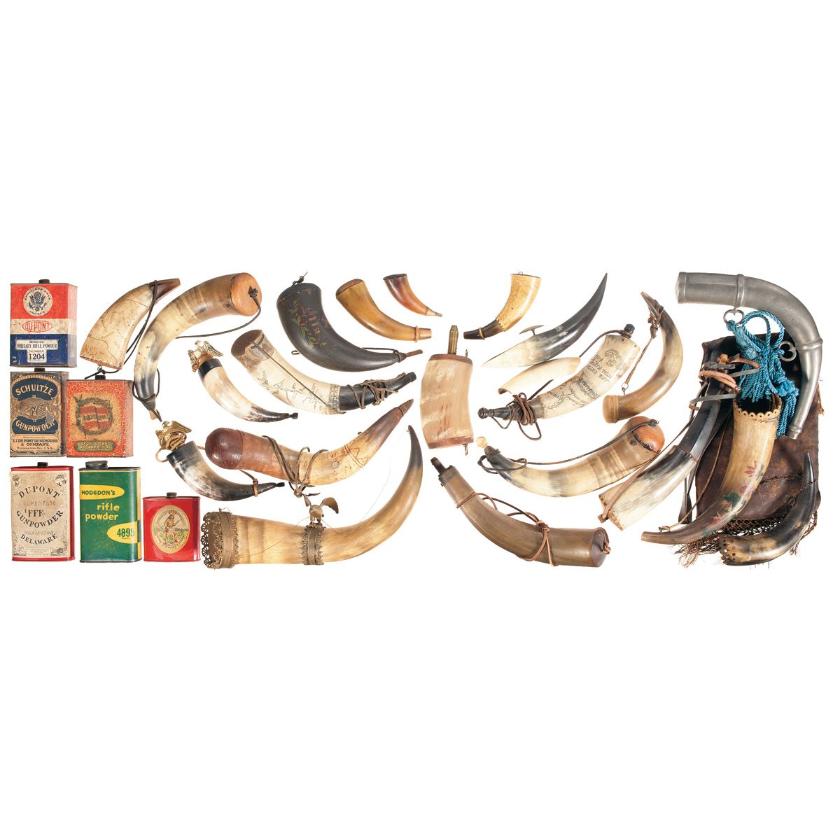 13" long powder horn with crude carving, 10" long powder horn, 6" long powder horn with metal eagle on base, scrimshaw 7" long powder horn showing map of New York depicting Ft. Ticonderoga, 13" long powder horn with ornate bands and metal eagle, 6" long powder horn (couple long cracks), 6" long powder horn with metal eagle on base, 8" long powder horn with fabric base, 7 1/2" long powder horn with measuring spout, 12" long metal powder horn, 3 1/2" long powder horn, 10 1/2" long powder horn, 11" long powder horn with measuring spout, 11 1/4" long powder horn, scrimshaw 10" long powder horn with map of Albany, NY, scrimshaw 5" long powder horn with floral design, 8" long powder horn with painted floral design, scrimshaw 9" long powder horn with map of Onterio and New York, leather purse/bag (poor condition), 10" long horn with painted floral motif and carrying strap, 7 1/2" long horn with chain carrying strap, horn ashtray, Du Pont military rifle powder No. 1204 can, Hodgdon's rifle powder can, Indian Rifle Gunpowder can, Du Pont Superfine FFF Gunpowder can, Laflin & Rand Smokeless Powder can, Schultze Gunpowder can. The powder horns are very good and the gunpowder cans are very good or better overall.