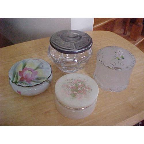 Powder Jars, Set of 4; (1)Flint Glass, heavy, silver embossed cover; 4.25" Diameter X 3.5 " tall; (2) Alabaster, made in Italy, hand carved, hinged cover with bouquet of flowers on top; 3.25 X 1.75" tall; (3) Nippon China signed on bottom; 3.5" diameter X 2.75" tall to top of cover, embossed with lrg. flower on base and cover. (4); frosted embossed Vic. era, 3.5" diameter X 3.50" tall to top of cover with painted flowers.