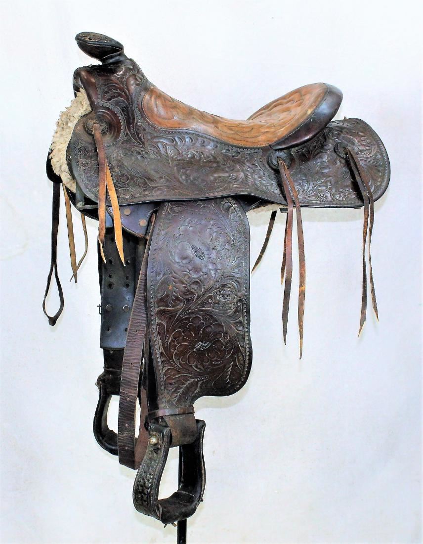 Unique Mother Hubbard style saddle with full flower tooling, rich chocolate color and full quilted seat with Cheyenne rolled cantle.