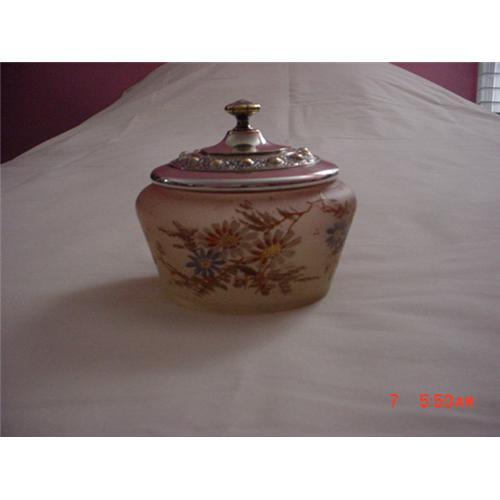 This is a handpainted, frosted pink glass powder bowl. It is very delicate and pretty. It is in perfect condition. The lid is metal with a very attractive decoration.