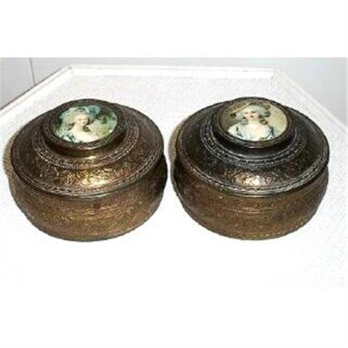 A pair of fancy powder dishes with glass inserts, mirrored backs to the tops and celluloid plaques on the tops. They are marked on the bottom: P.N.G.W. Made In USA.