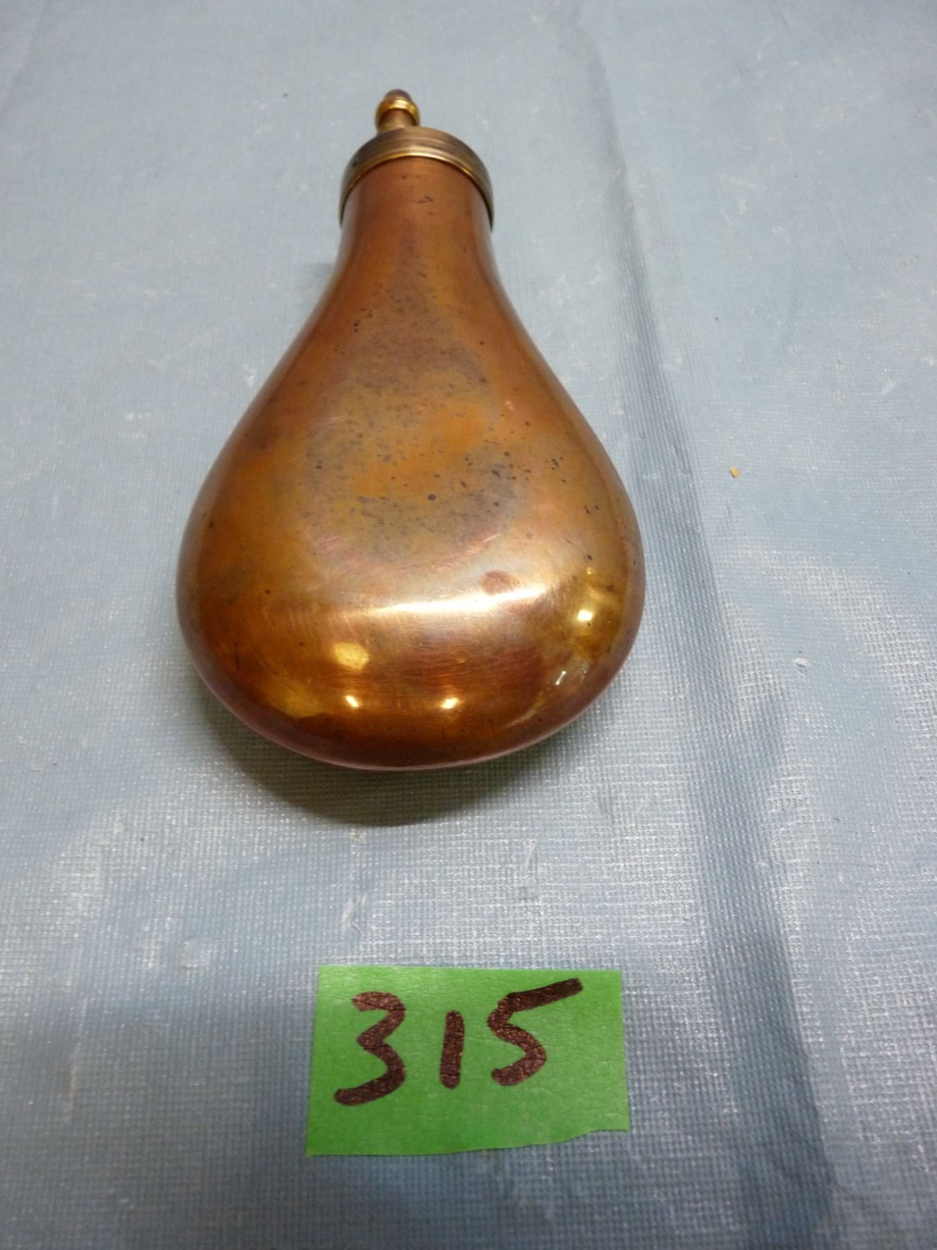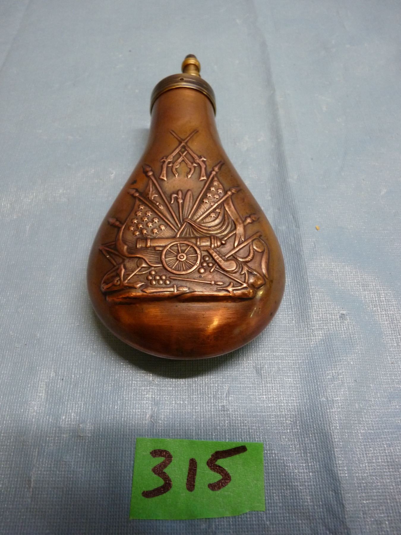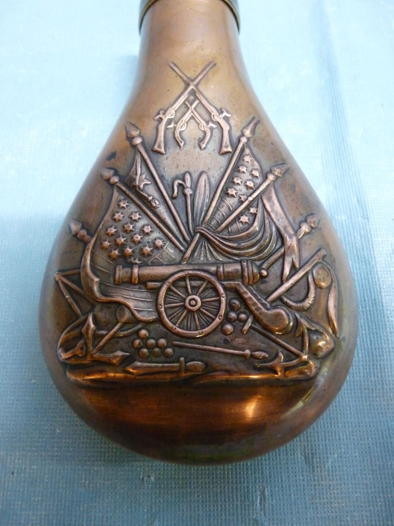 Powder flask- stand of flags and cannon / swords/ pistols and rifles- plunger type spout to charge a revolver cylinder- colt?- copper and brass- excellent condition