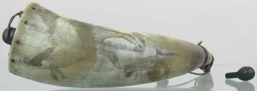 Powder horn from an Onset, MA collection with engraved ducks flying over a marsh. Complete with carved wooden plugs. In XOC. (decoy)