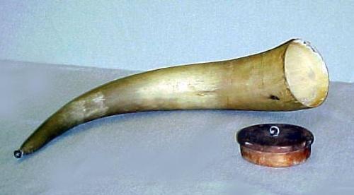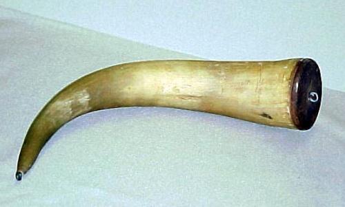 Powder horn; wooden cap; with rings for hanging strap; 14" (wear to end of horn) 19th C.