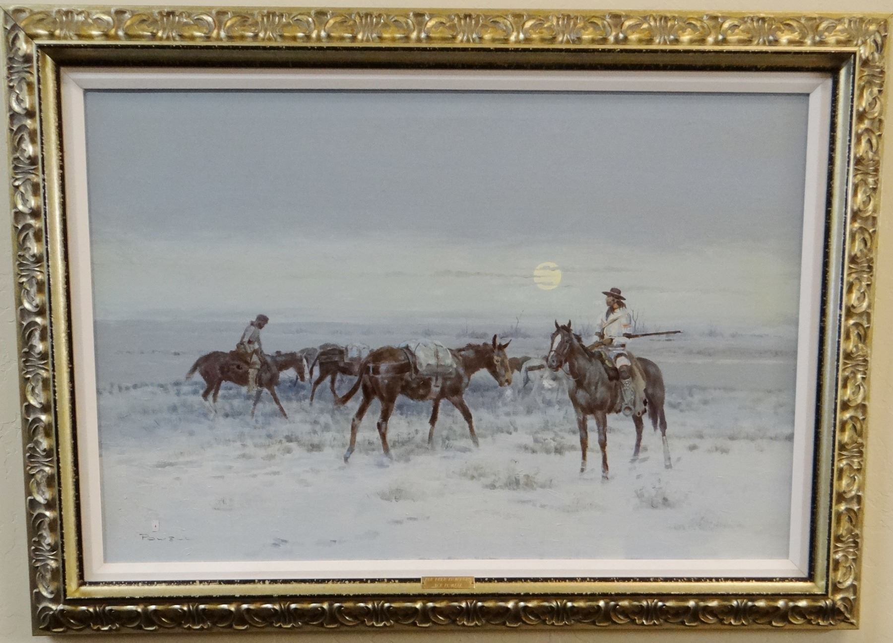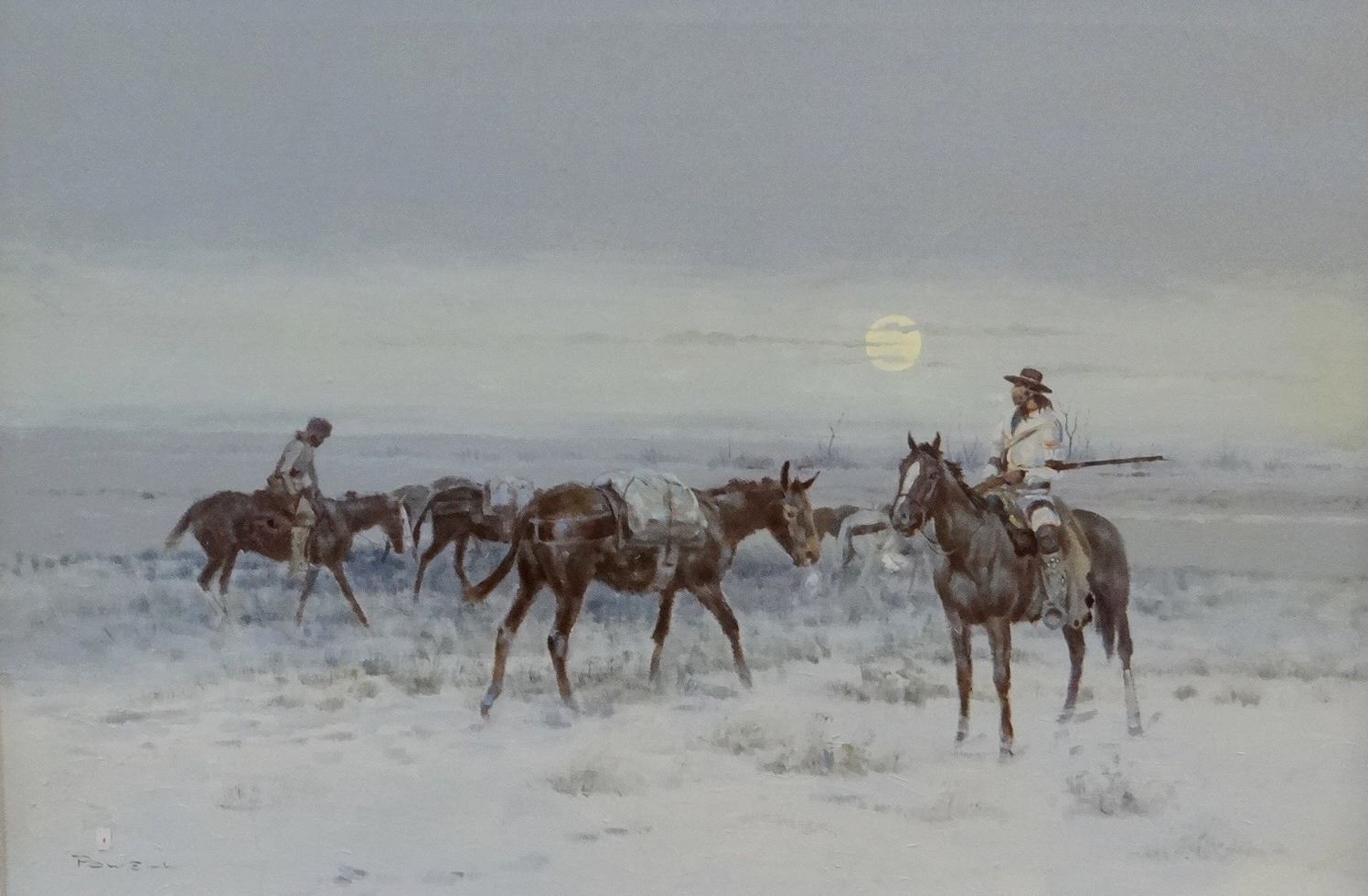 Powell, Ace, The Free Trappers, original oil on canvas, 24" x 36", outstanding painting by Ace. Signed lower left corner. Est. $4,000 - $6,000