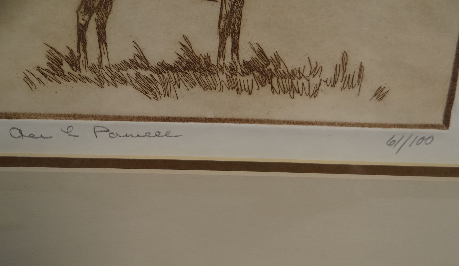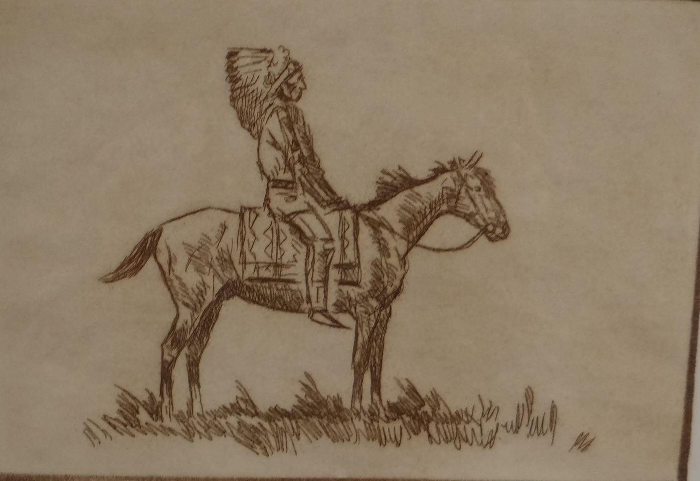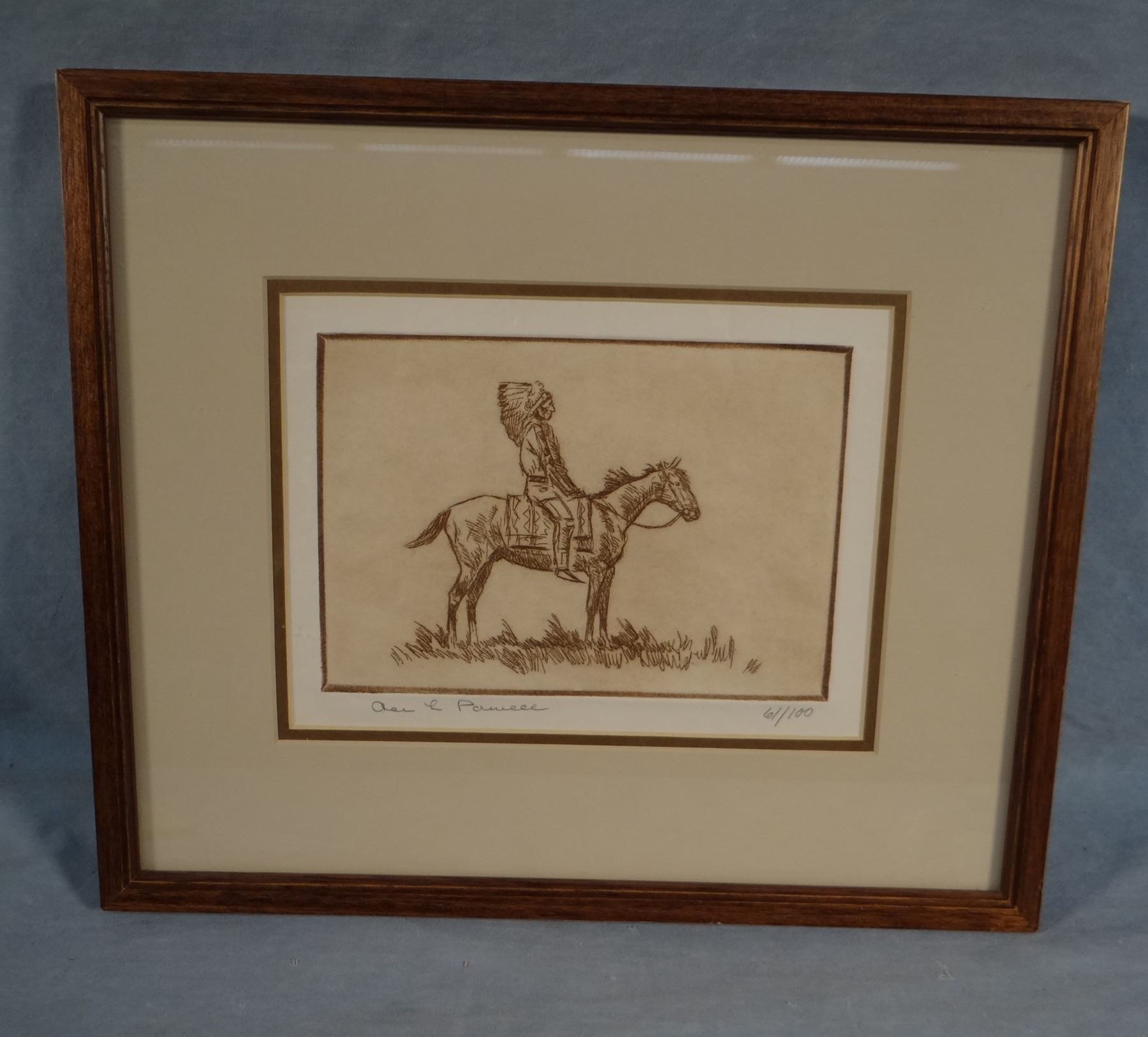 Powell, Ace, framed etching, Indian on horse, 61/100, 5”x 7”