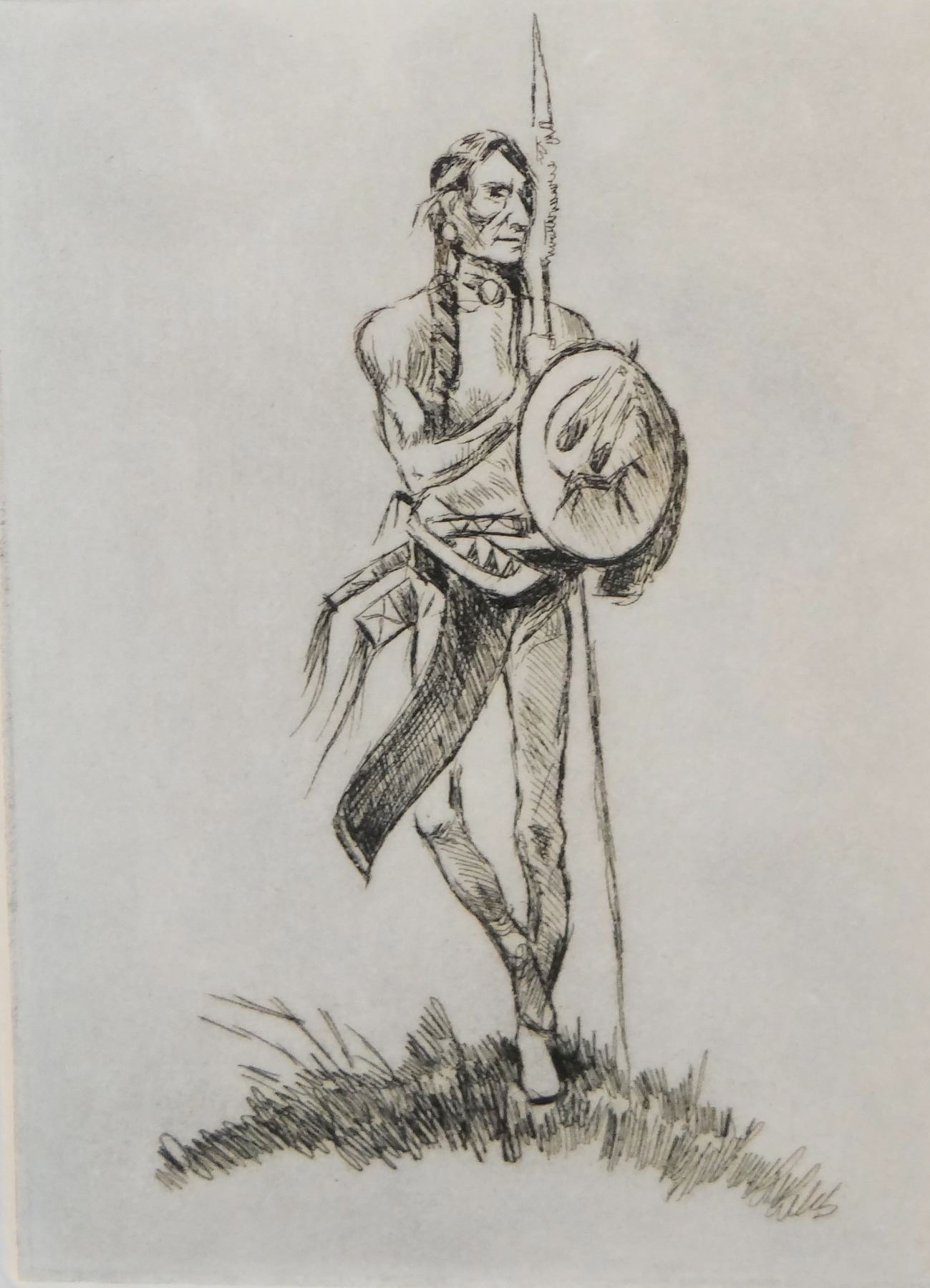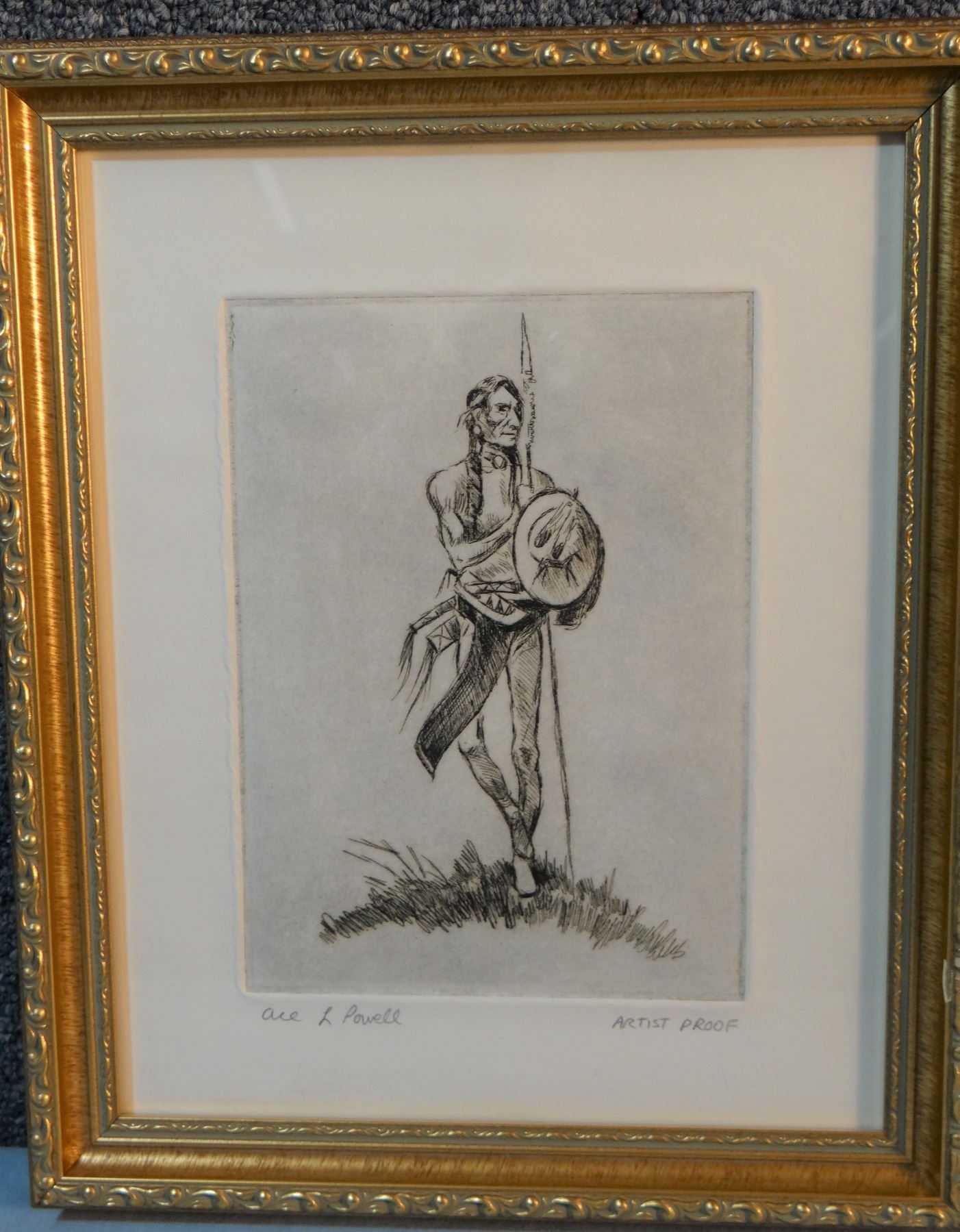 Powell, Ace, etching, Standing Indian, 7" x 5", Note this is an etching, not a pen/ink.