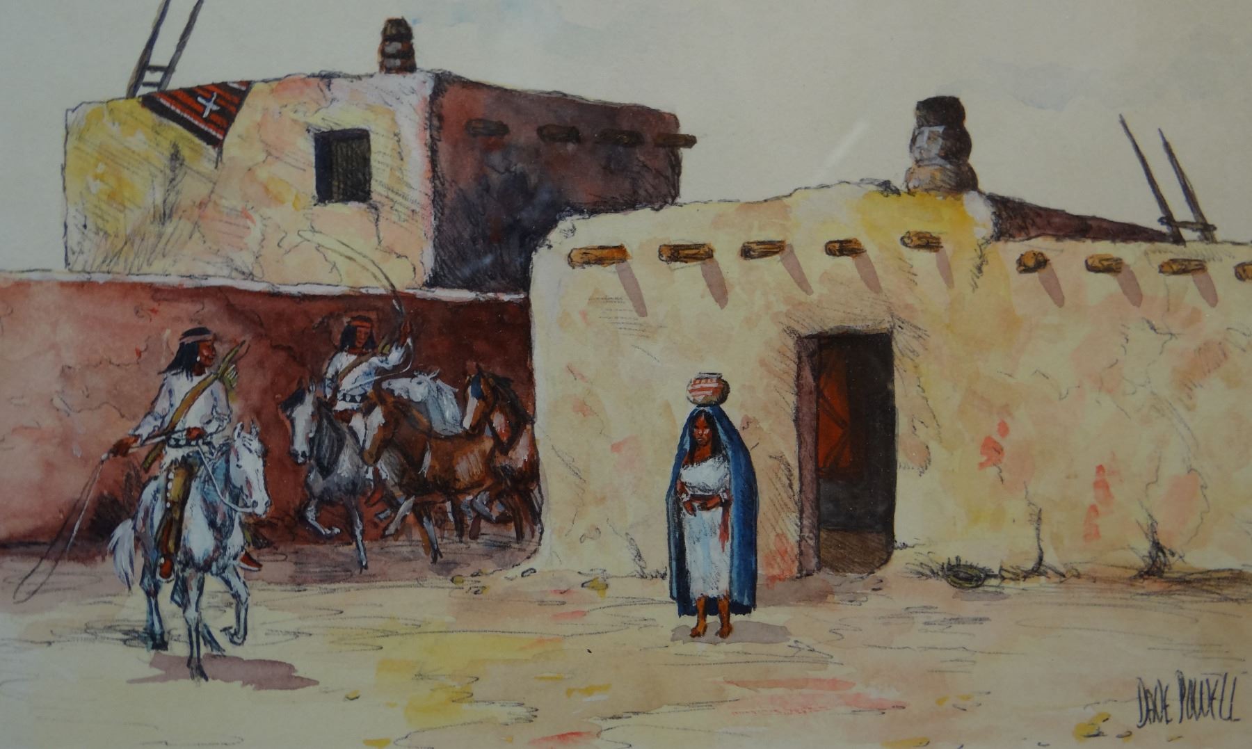 Powell, Dave, watercolor, Return of The Raiders, 6" x 9".Dave and his family reside in central Montana, just a short drive from Charlie Russell's home in Great Falls.(2010) There he is constantly inspired by the very buttes and prairies that Russell himself loved and painted.