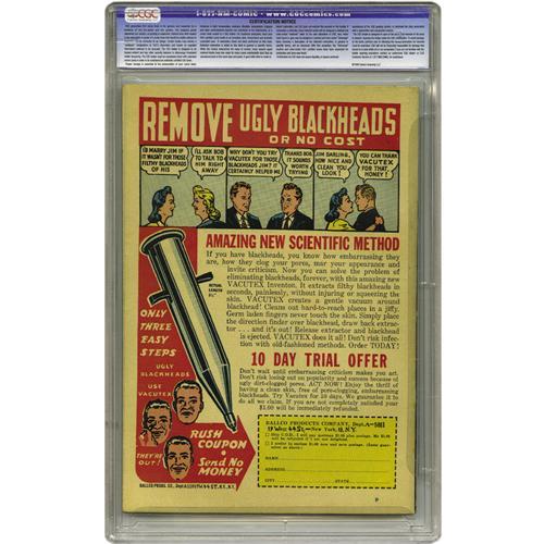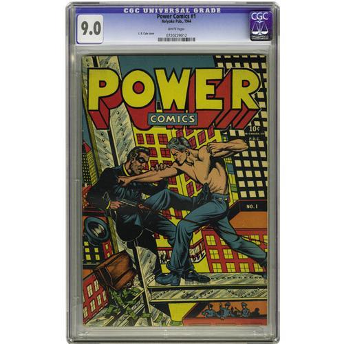 <B>Power Comics #1 (Holyoke Publications, 1944) CGC VF/NM 9.0 White pages.</B></I> Even though it had a brief run of only four issues, <B>Power Comics</B></I> is fondly remembered due to the exquisite covers drawn for the series by L. B. Cole, including the one on this issue, which packs a big, bright wallop! Overstreet 2006 VF/NM 9.0 value = $1,463; NM- 9.2 value = $2,000. CGC census 3/06: 1 in 9.0, 1 higher.