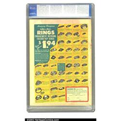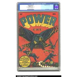 Power Comics #4 (Holyoke Publications, 1945) CGC FN/VF 7.0 Off-white to white pages. L. B. Cole finishes off this fantastic run with another of his instantly recognizable covers, featuring giant birds swooping in on the Black Raiders, attempting an attack amongst a pile of giant jewels. Cole was astute in noticing the effect covers had on the consumer, and always made a point to set his books apart from others, using wild color schemes and catchy images; he was truly a master of his art form. This copy has a VF appearance, but was downgraded due to rusty staples. Overstreet 2002 FN 6.0 value = $444; VF 8.0 value = $925. Important notice: We expect to be auctioning lots at the rate of 200-250 per hour. Sometimes eBay Premier live bid software cannot keep up with that pace, so we strongly recommend that you place a realistic proxy bid now as insurance to avoid disappointment. Also please note that all Heritage/CAA lots purchased through eBay Premier carry a 20% Buyer's Premium. Please make sure you read the Terms and Conditions.