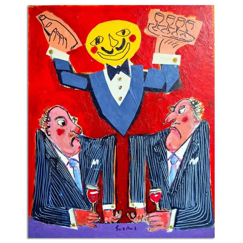 Power Lunch By Ensrud Original. "Power Lunch" is an original Mixed Media on Board by Wayne Ensrud. The piece is hand signed by the artist and comes with a Certificate of Authenticity. Measures approximately 20" x 16".