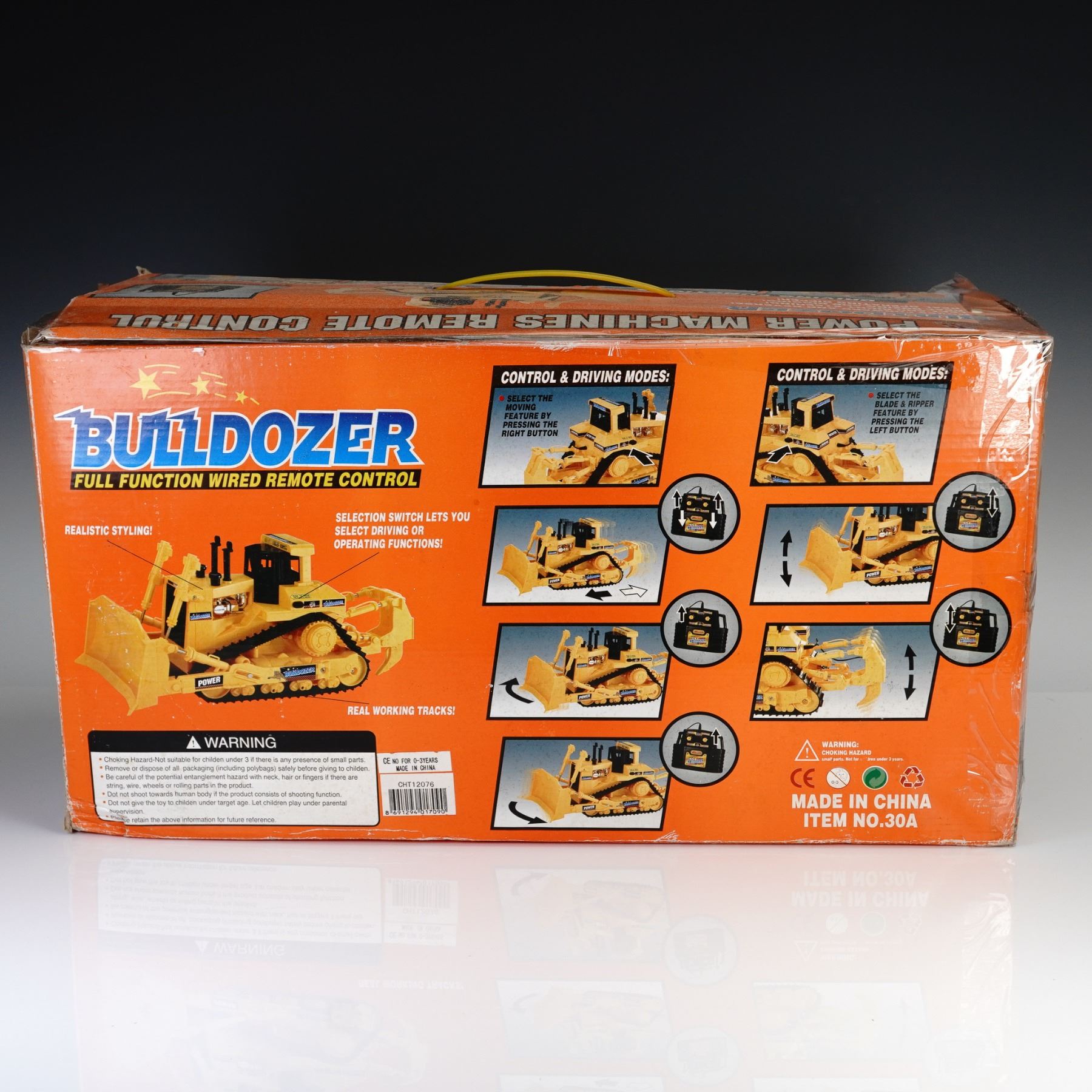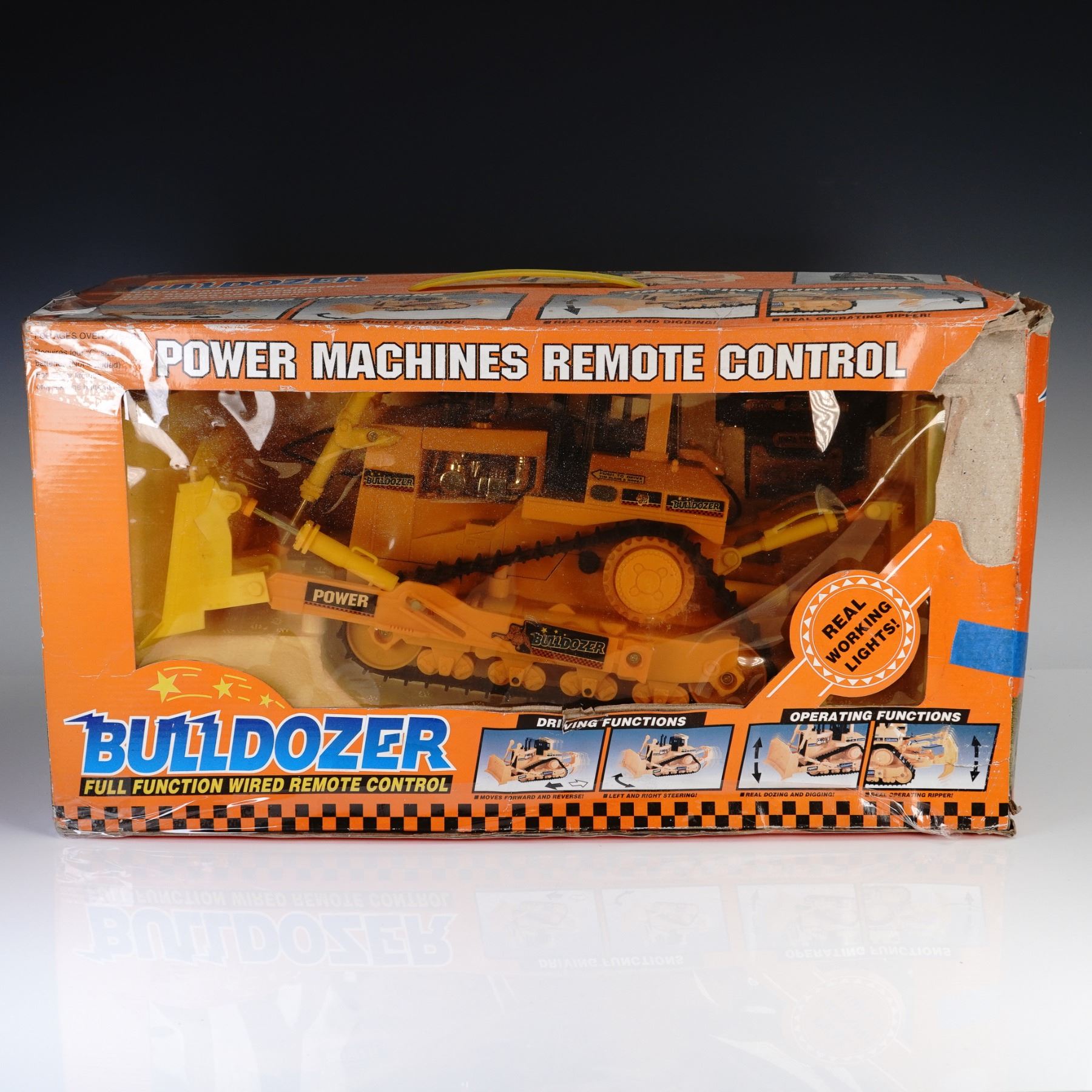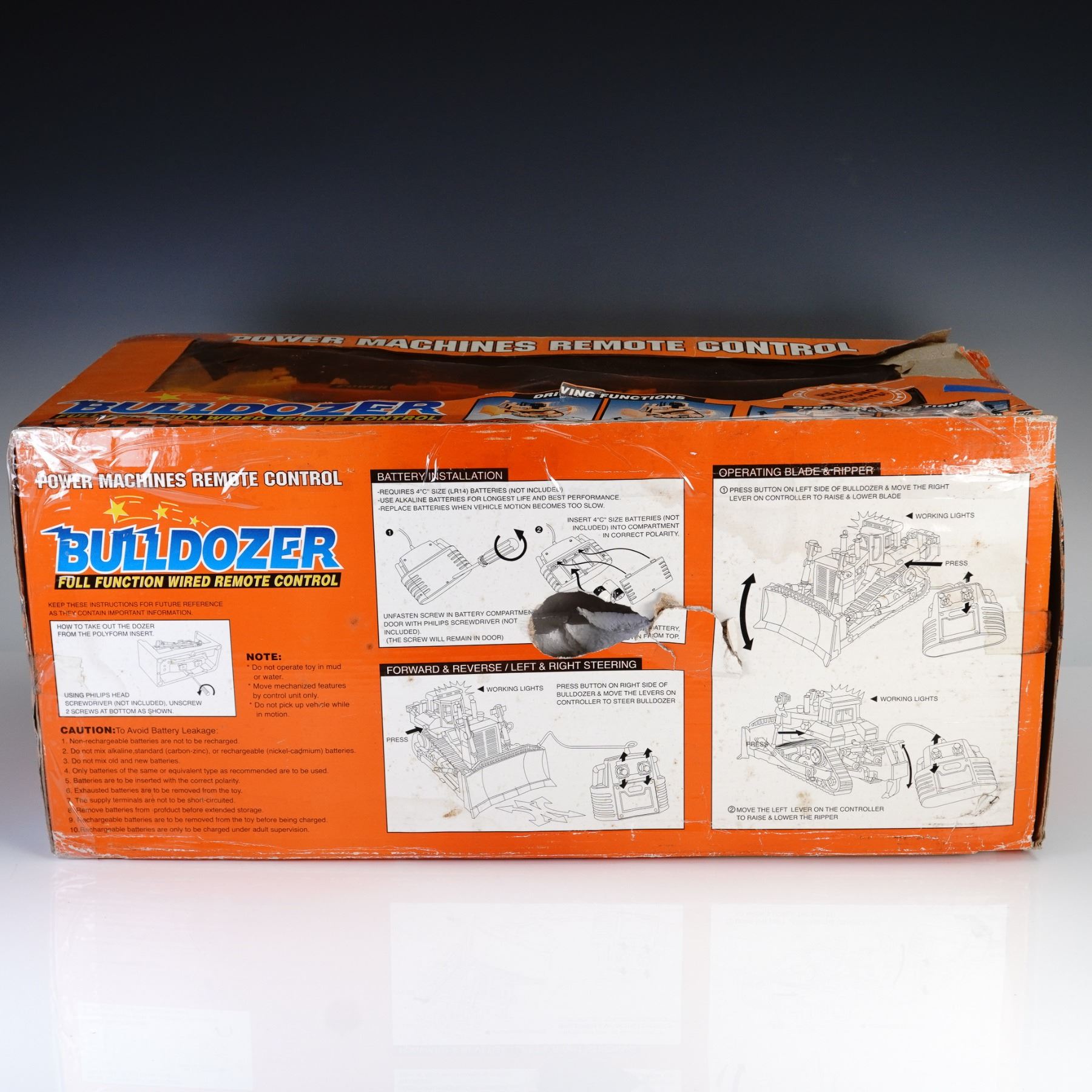 This Power Machines Bulldozer is a full-function wired remote control toy featuring real working lights and responsive driving and operating actions. The model showcases forward and reverse movement, left and right steering, and operable blade and ripper functions for added realism. Designed in a rugged yellow finish with black detailing, it appeals to young construction enthusiasts. The toy bulldozer itself measures approximately 16"L, and it comes in the original packaging, which measures 22"L x 11"H.