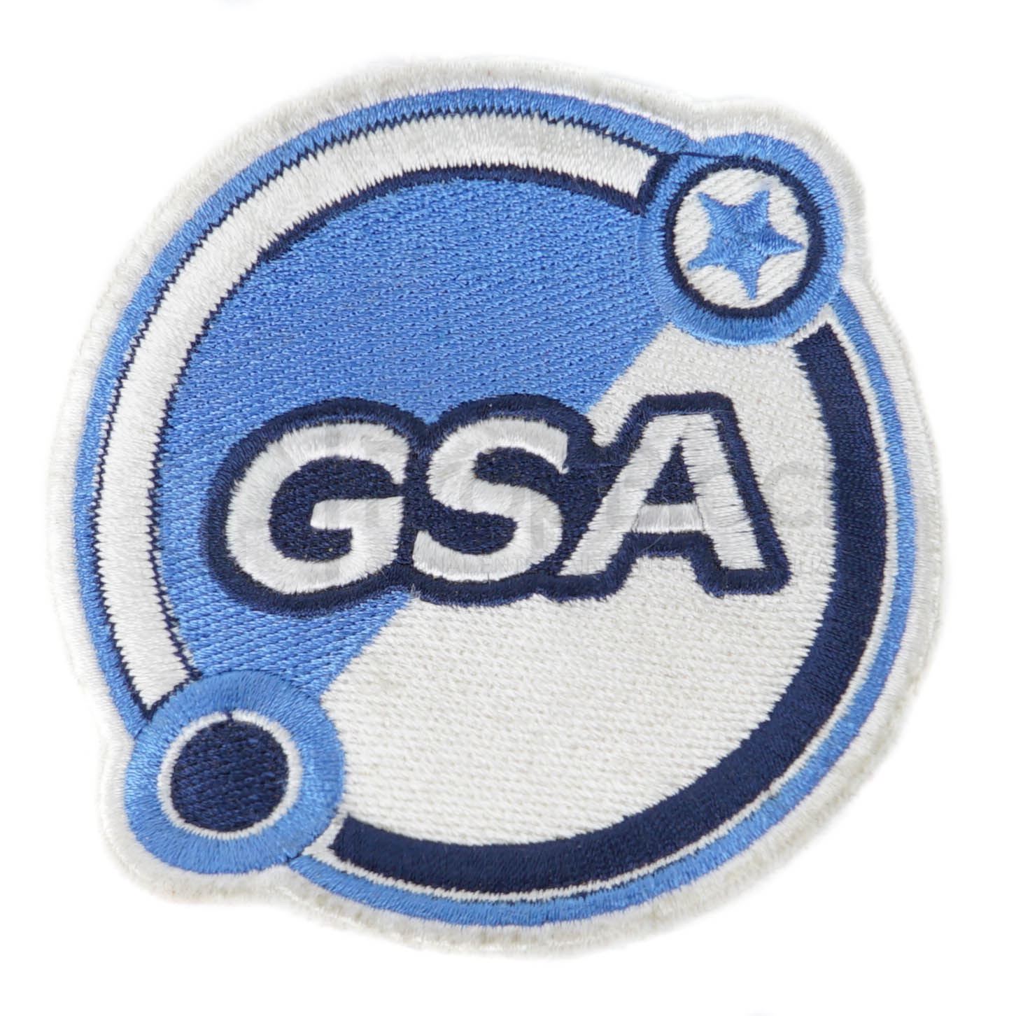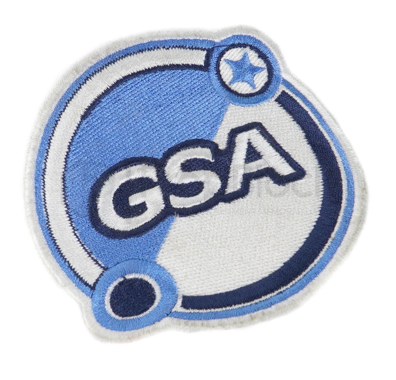 GSA (Galactic Space Alliance) patch used in the production of the superhero television series Power Rangers Lost Galaxy. Power-Packed Adventure! Action-Packed Fun! A time in the future. The space colony Terra Venture journeys beyond Earth in search of new worlds. Peace reigns throughout the cosmos...or does it? These patches can be seen on the shoulders of the alliance military soldiers. This is around embroidered patch, white in color with the letters GSA in blue. This piece remains in excellent, production used condition.