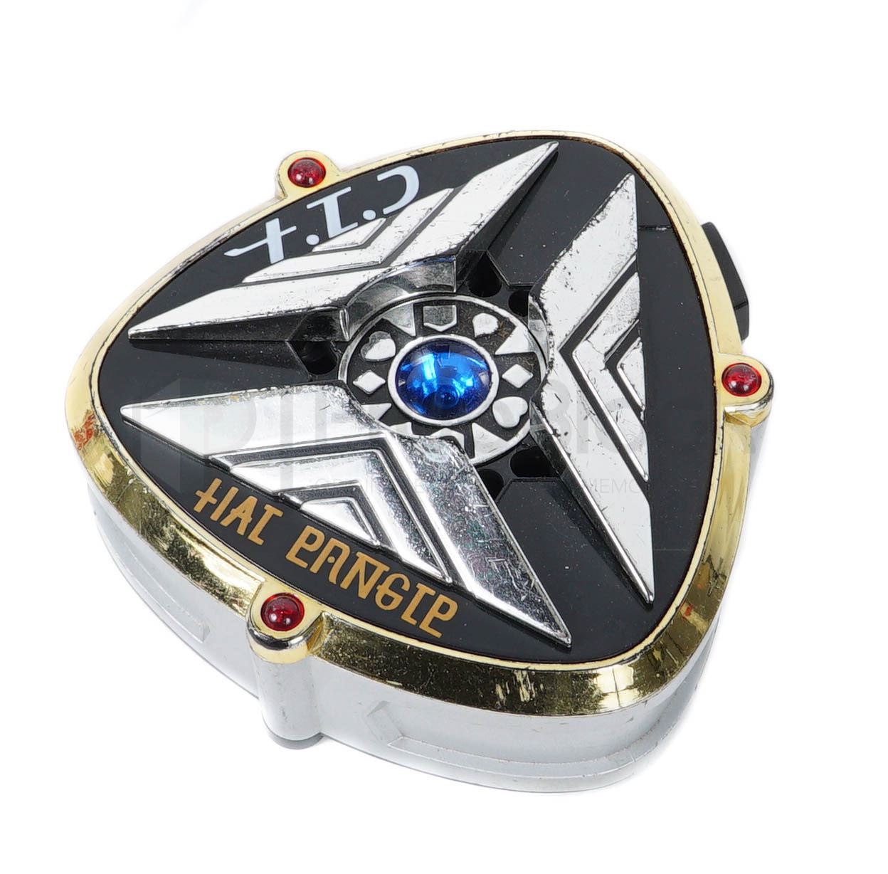 Time force badge used in the production of the superhero television series Power Rangers Time Force. The Time Force Power Rangers travel to the past to stop Ransik and his band of criminal mutants. These badges can be seen throughout the series and were used as the teams "Morphers" as well as to seal enemies into cryo-chambers. This piece is a commercially available licensed toy which was used by the production as a prop. Made of plastic, this item opens up when a button is pushed and lights up the front. This piece remaisn in excellent, production used condition.