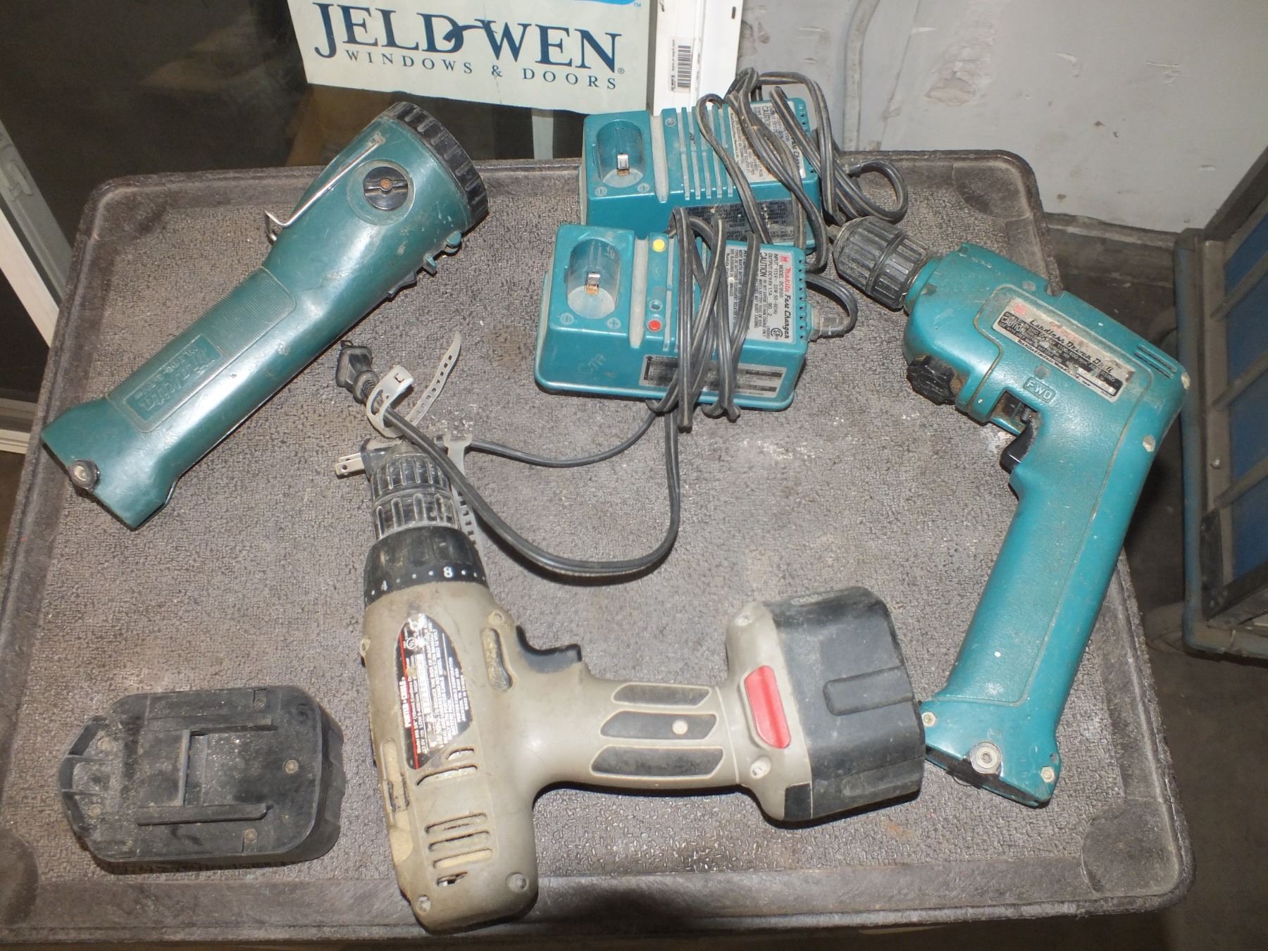 you get Makita Drill & Flashlight, 2 batteries and 2 chargers, also you get 1 porter cable Drill w/ 2 Batteries but no charger...used