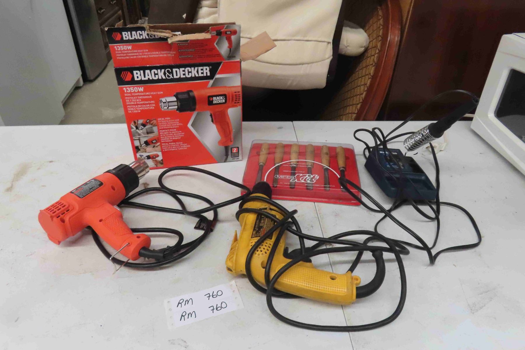 Power Tools: Dewalt 3/8 RSR Drill, New B=D Heat Gun, Soldering Iron, 6 PCS Chisel Set