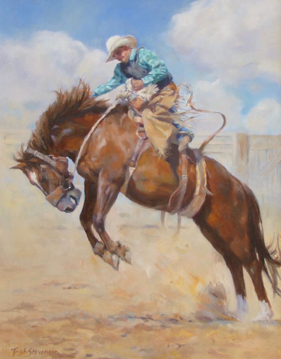Artist: Trish Stevenson. Title: Power Trip. Medium: Oil. Size: 20" x 16". Framed size (if applicable): 26" x 22" Artist's description: Sometimes I am fortunate enough to witness a classic bronc ride in which the horse and cowboy are both at the top of their game, very well matched in their strengths and therefore put on a great show, each determined to come out on top. My mission here was to portray that determination through their body language, straining muscles and expressions. I think most people can relate to a struggle that they put their "all" into and maybe that's why it's so fun to watch. Shipping from ZIP CODE 59262.