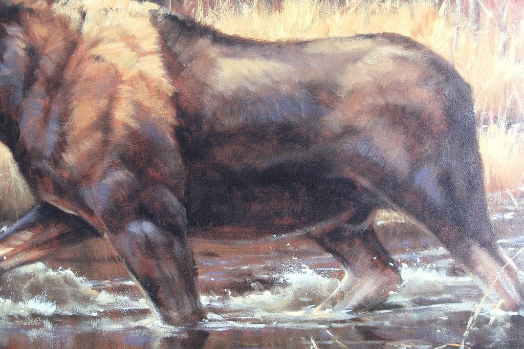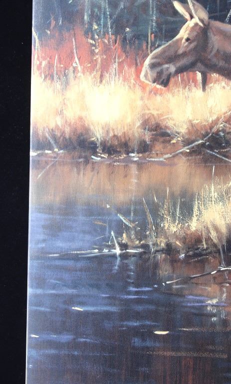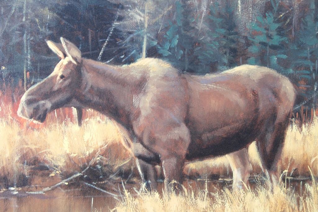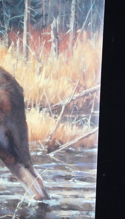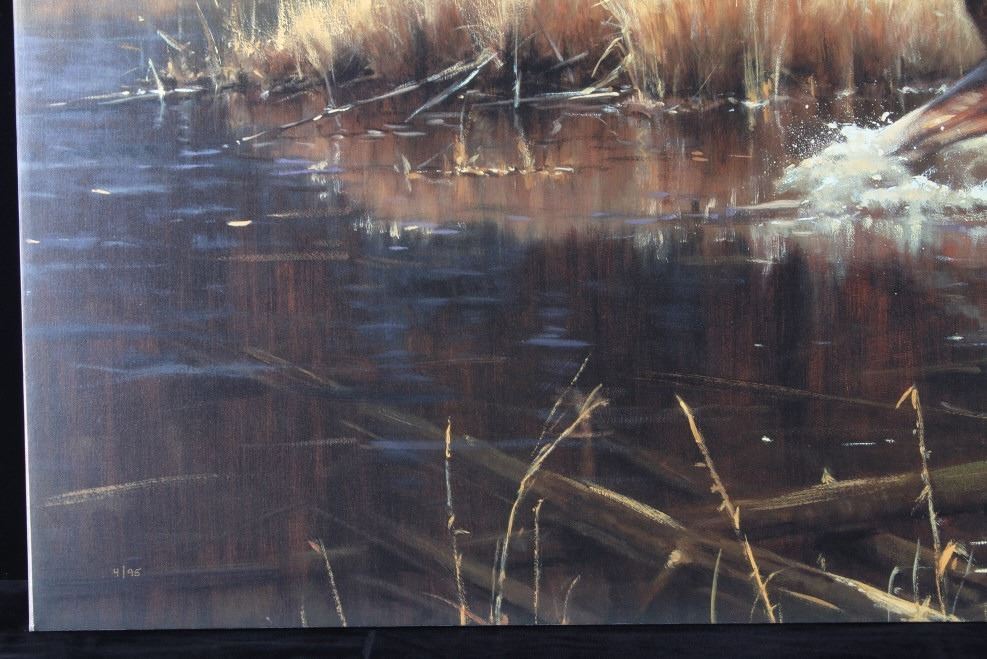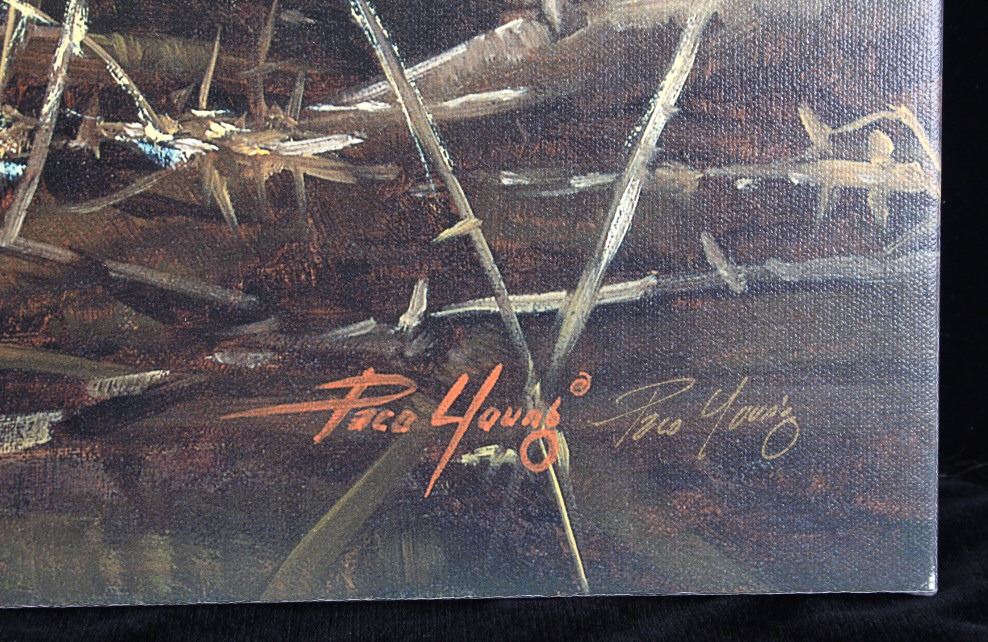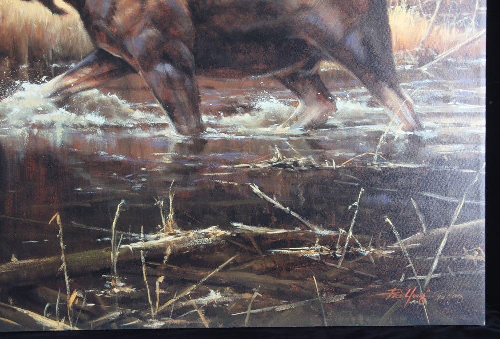 Presented in this lot is a Limited Edition, Signed Giclee on Canvas, "Power and Grace", by Paco Young, #4/95. Ray (Paco) Young’s subjects were almost entirely derived from trips to nearby Yellowstone, Grand Teton and Glacier National Parks. He once said, “There’s an endless source of inspiring subject matter in the Northern Rockies. Reflecting a level of maturity that comes from years of passionate work and dedication, Young’s paintings evolved into a painterly style well-suited to convey the wild beauty of his surroundings. During a career that spanned more than 20 years, Young exhibited at hundreds of gallery and museum shows including the Leigh Yawkey Woodson Art Museum, C.M. Russell Museum, Gilcrease Museum and the Trailside Galleries. The National Park Service commissioned him to do a painting of Old Faithful, the famous geyser in Yellowstone National Park. Young’s 4' x 6' original oil has now been permanently installed over the grand fireplace at the historic Old Faithful Inn. Young was also commissioned by the National Park Service to complete a 8 X 6 foot painting of a standing grizzly for the Lewis and Clark Interpretative Center in Nebraska City, Nebraska. Raised in a family of musicians in Nashville, Tennessee, wildlife painter Paco Young opted for a profession of art instead of music. He earned a BFA from the Memphis Academy of Arts and became a highly successful wildlife and landscape painter. For ten years, his studio was in Atlanta, Georgia where he did traditional wildlife painting, but in 1994, he and his family moved to land on the Gallatin River near Bozeman, Montana. There he avidly pursued fly fishing, and his painting was directed to the landscape, especially winter scenes. Young discovered his passion for plein air landscape painting while living in Montana. Paco Young's paintings are noted for his use of light and his ability to capture an animal in his natural