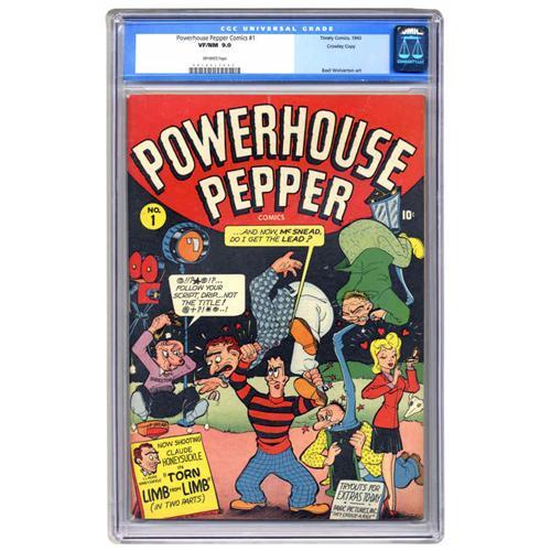 <B>Powerhouse Pepper Comics #1 Crowley Copy pedigree (Timely, 1943) CGC VF/NM 9.0 Off-white pages.</B></I> Basil Wolverton's comedy hero got his start in <B>Joker Comics</B></I> before getting his own book. Evidently even the competition liked Wolverton's comics -- this copy's from the collection of Wendell Crowley, an editor at rival Fawcett. Overstreet 2005 VF/NM 9.0 value = $1,778; NM- 9.2 value = $2,400. CGC census 11/05: 3 in 9.0, 1 higher.