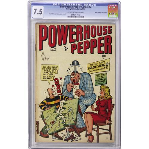 <B>Powerhouse Pepper Comics #2 Davis Crippen ("D" Copy) pedigree (Timely, 1948) CGC VF- 7.5 Off-white to white pages.</B></I> This is the funniest Basil Wolverton cover we've seen! Wolverton drew the rest of the issue as well. Overstreet 2006 VF 8.0 value = $544. CGC census 9/06: 3 in 7.5, none higher. <I>From the Crippen Collection</B></I>.<BR><BR><b>Shipping:</b> Slabbed Comic (<a target="_blank" href="http://www.heritageauctions.com/common/shipping.php">view shipping information</a>)