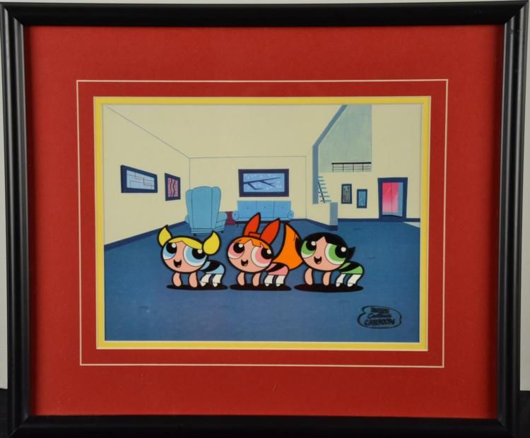 This is an original animation cel that was used in the production of an episode of The Powerpuff Girls. Blossom, Bubbles, and Buttercup are all here, praNcing across the living room and ready to take on the bad guys! * Medium: Hand-painted cel acetateImage size: 9 x 12 inchesFraming: Double matted in yellow and red, in matte black laminate wood frame Frame size: 16 1/4 x 19 1/4 inchesCondition: ExcellentCertificate of Authenticity: Included