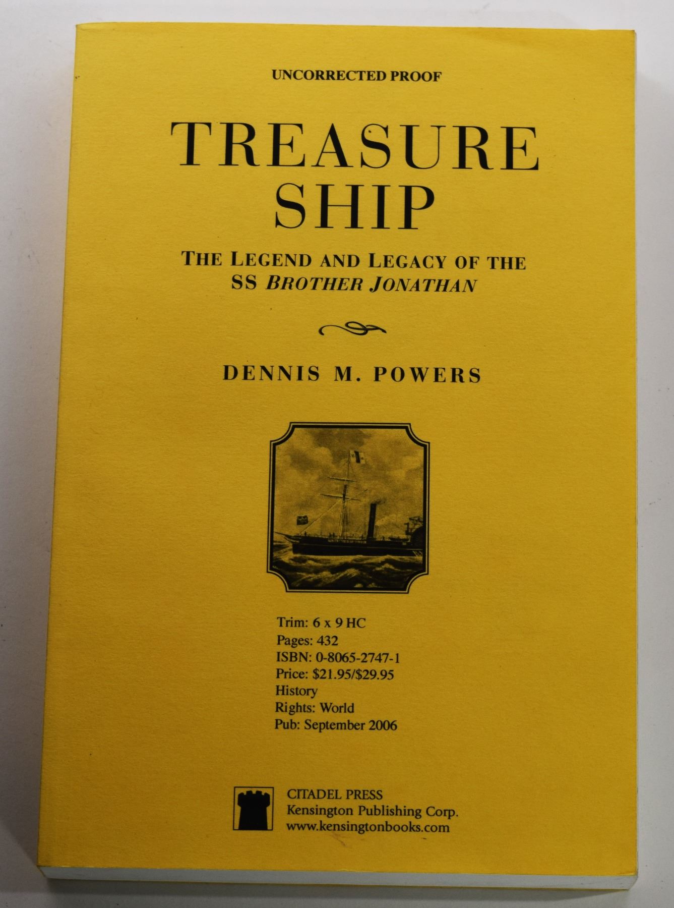 Powers, Dennis M. TREASURE SHIP: THE LEGEND AND LEGACY OF THE SS BROTHER JONATHAN. Citadel Press/Kensington Publishing Corp. 2006. 12mo, 416 pages; Softcover; Uncorrected Proof copy; This book recounts the history of the 'S.S. Brother Jonathan', a sidewheeler that sank off Northern California in 1865 carrying a large shipment of gold coins. It also tells of the struggle between the salvors and the State of California in getting a search permit approved and later a salvage permit.and the infighting between the investors. In the end, the lawyers were the real winners. Very well researched. Subject: History - Sunken Treasure