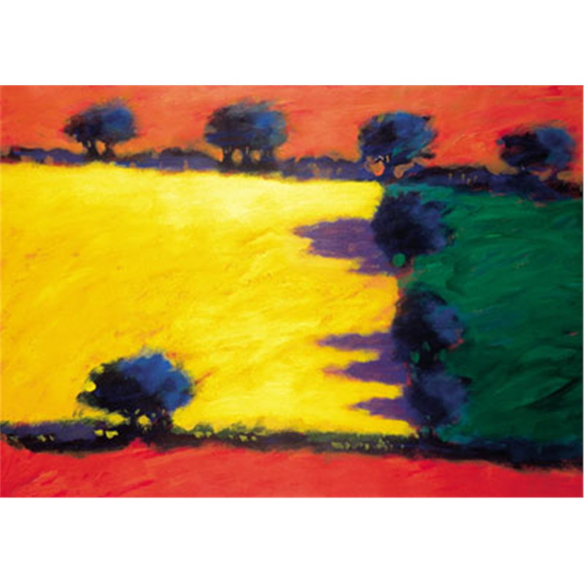 Abstract landscape is Paul Powis’ forte. He chooses large canvases and uses mathematical and geometrical structures throughout his paintings. Powis uses many brushes and claims to prefer the older worn out brushes best as they give the texture he prefers. After a relaxing set of T’ai Chi exercises he generally paints in the mornings only.
