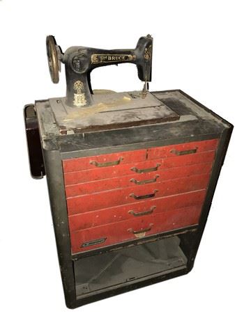 "Powr Kraft" metal industrial drawers set and "The Bruce" vintage sewing machine prop (approx. 3'9" tall)
