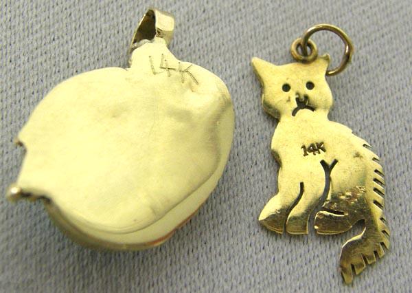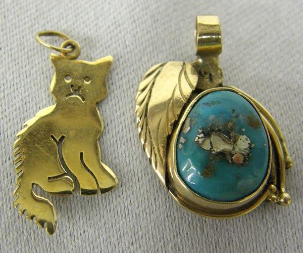 Pr 14kt Gold Pendants, kitty measures approx. 1''. The other pendant has a nice Nevada turquoise stone. Both pendants are marked 14kt. Buyers Pay Actual Shipping and Handling Charges(see terms and conditions for more information)