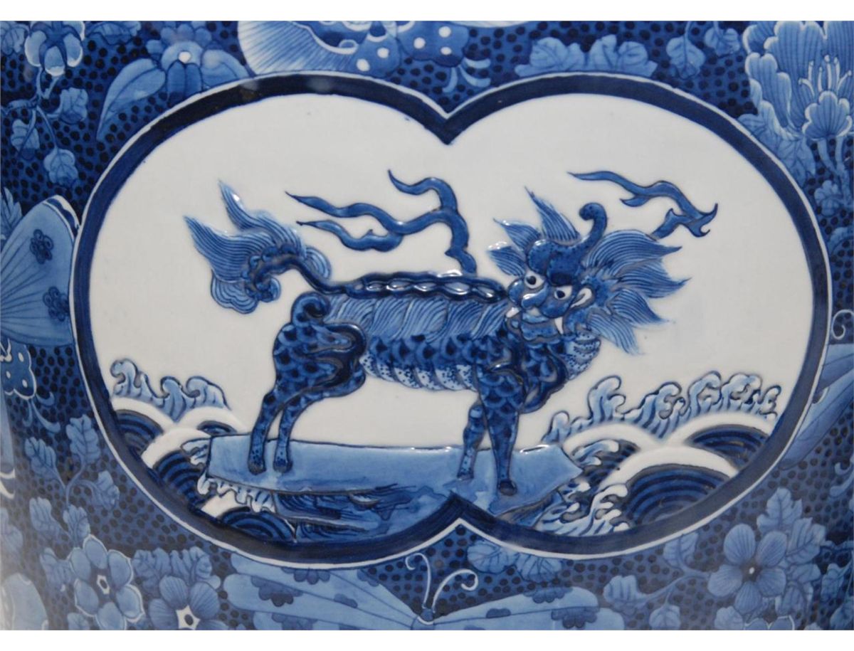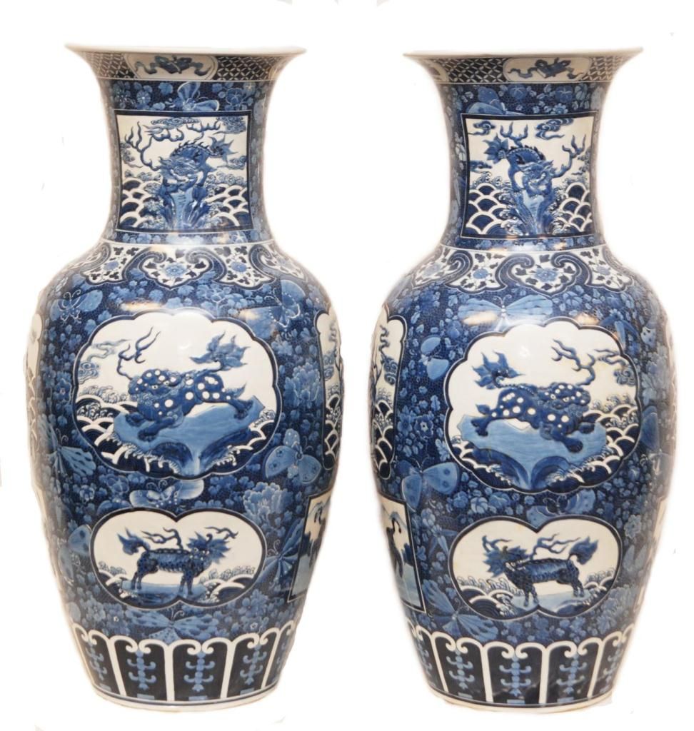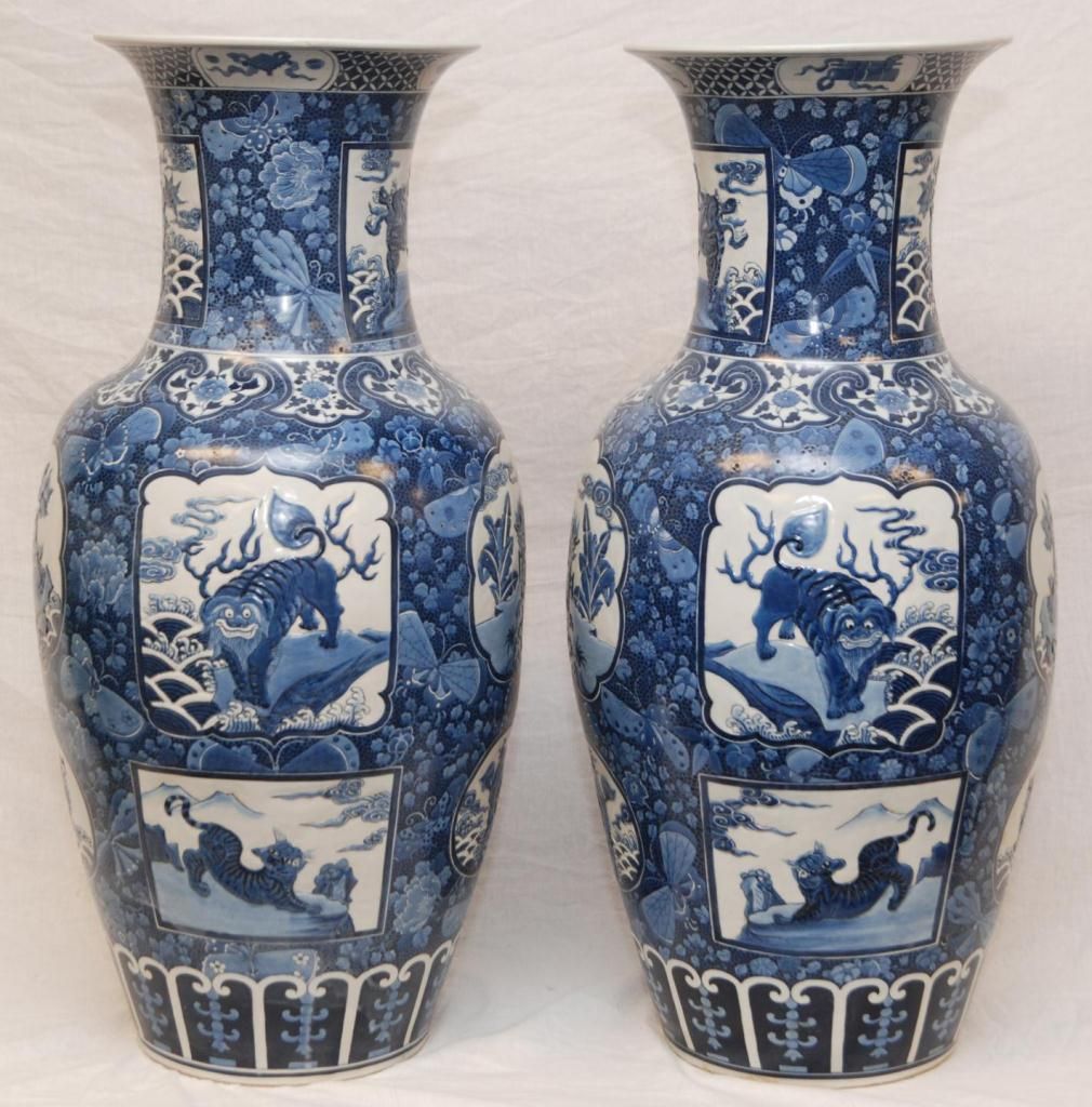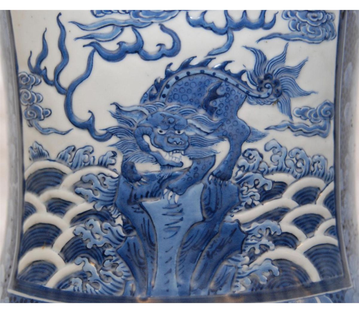 Antique Chinese pair of hand painted blue and white porcelain floor vases. Each of Phoenix tail form and depicting dragons, foo lions, kylin beasts, elephants and tigers in a raised design. Mid to late Qing Dynasty period. Each measuring approx. 29 5/8" height (75.4cm). Total weight of approx. 26.6 kilograms. Provenance: Sam Feldman collection.