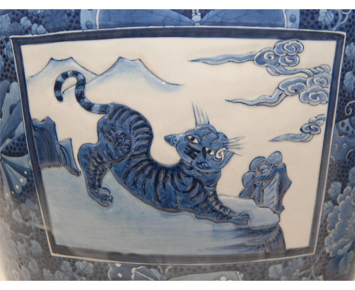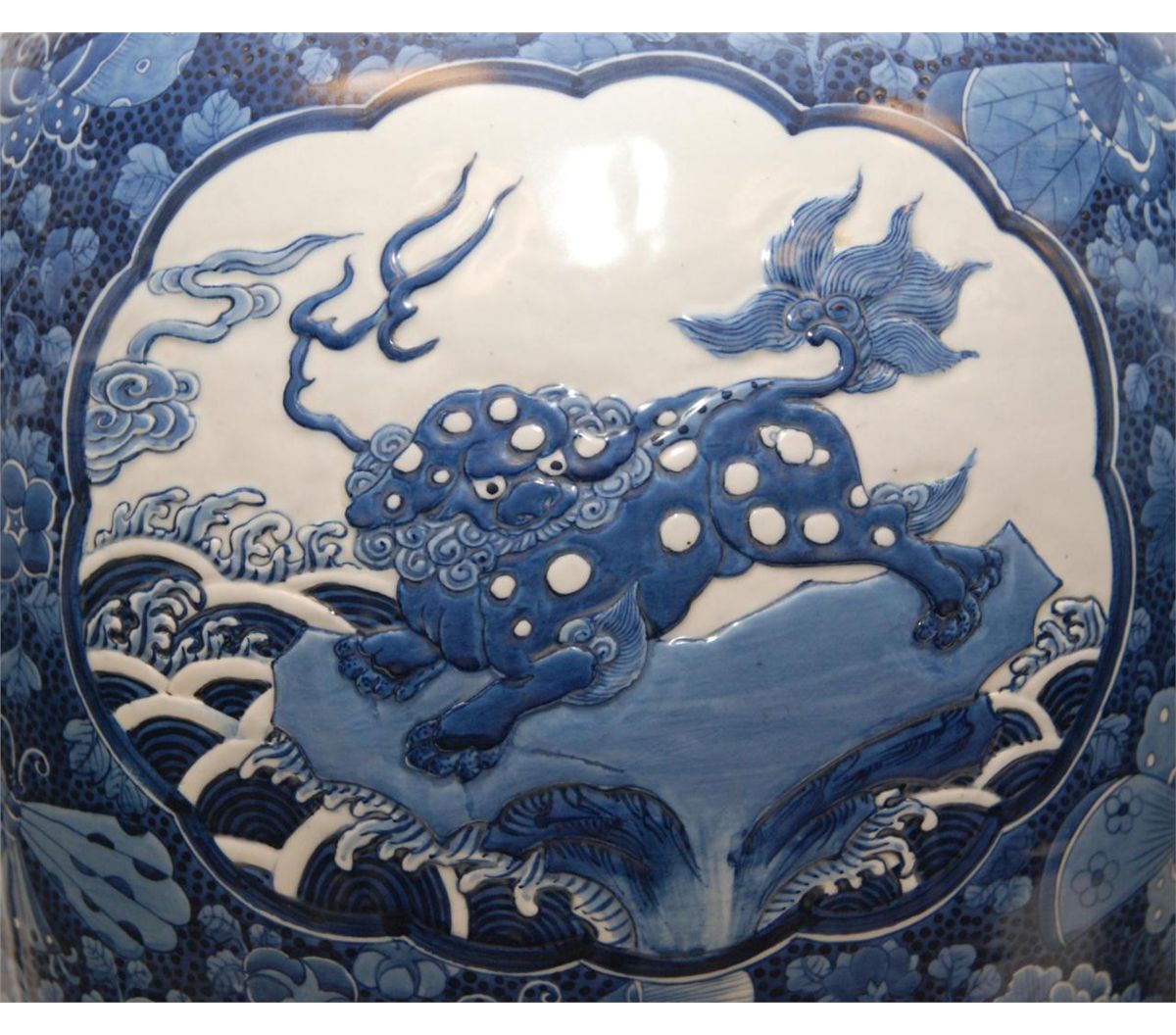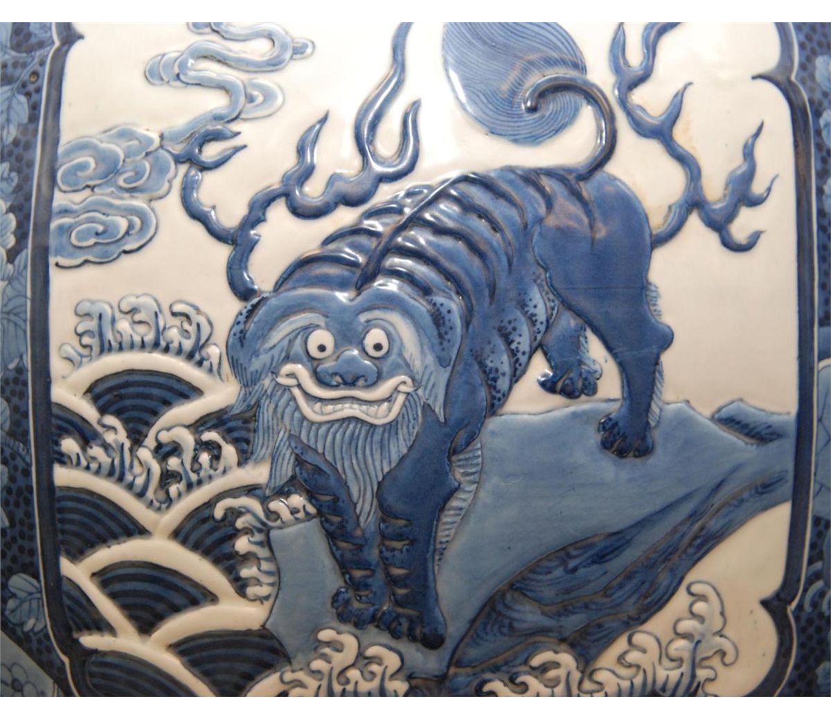 Antique Chinese pair of hand painted blue and white porcelain floor vases. Each of Phoenix tail form and depicting dragons, foo lions, kylin beasts, elephants and tigers in a raised design. Mid to late Qing Dynasty period. Each measuring approx. 29 5/8" height (75.4cm). Total weight of approx. 26.6 kilograms. Provenance: Sam Feldman collection.