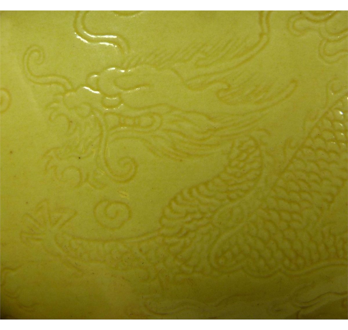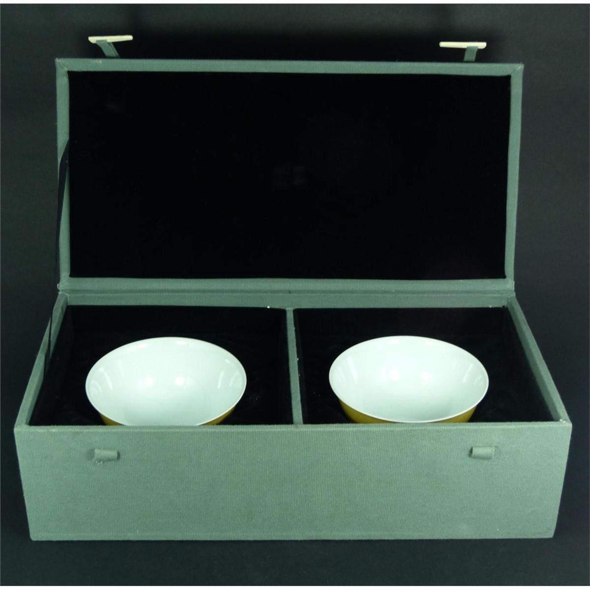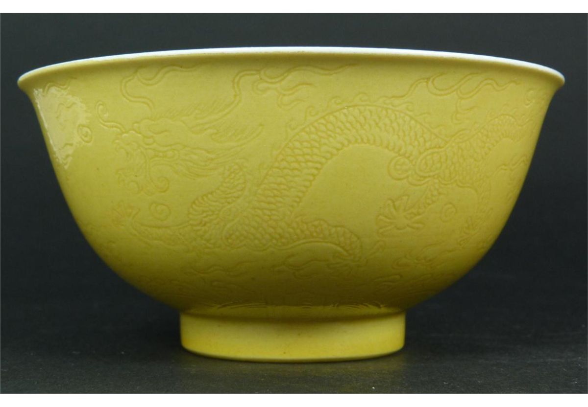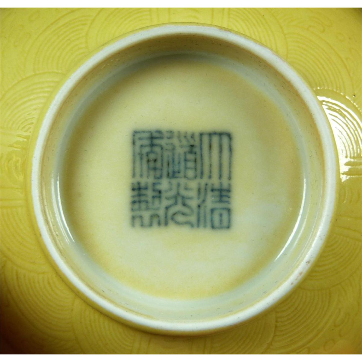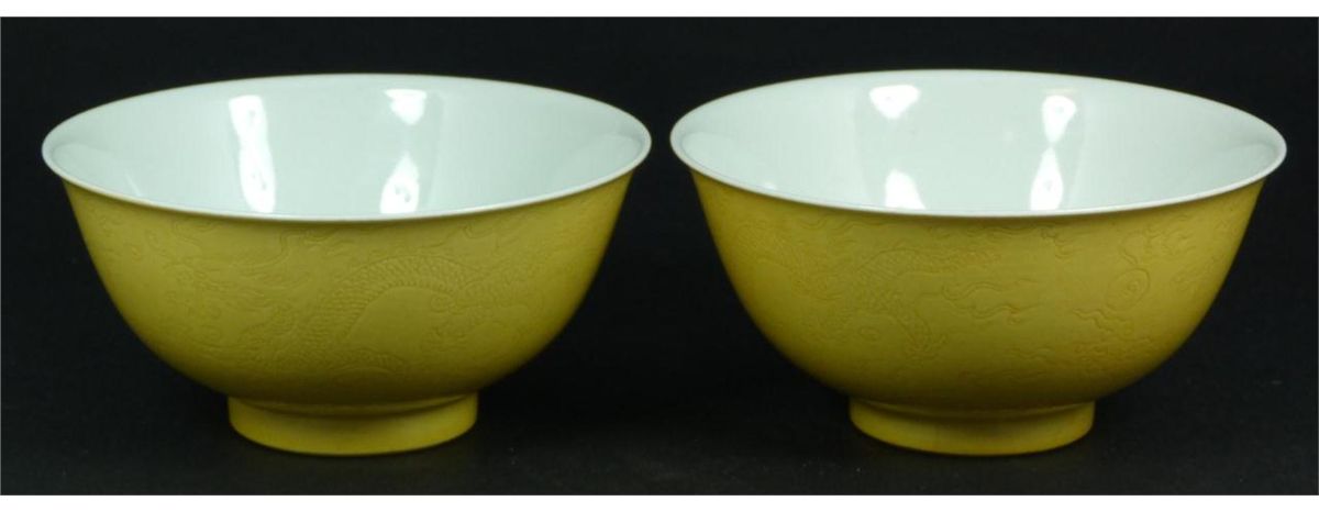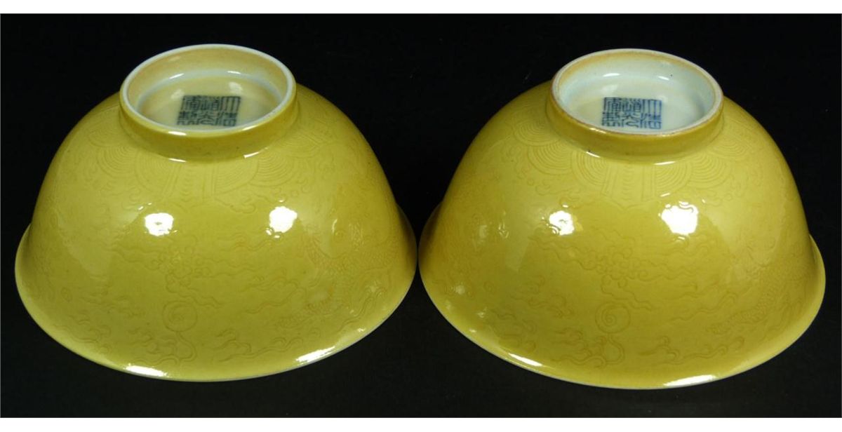 A pair of Chinese Qing Dynasty period yellow ground Anhua dragon bowls. Each having white interior and yellow glaze exterior depicting etched dragons with jewel amongst clouds over crashing waves. Bottoms hold blue six character archaic Daoguang (1821-1850) reign marks, and are of the period. Includes fitted presentation box. Measures 2 1/8" height x 4 1/2" diameter (5.4cm x 11.4cm). Porcelain weight of 241 grams. Provenance: From a prominent St. Louis collection.