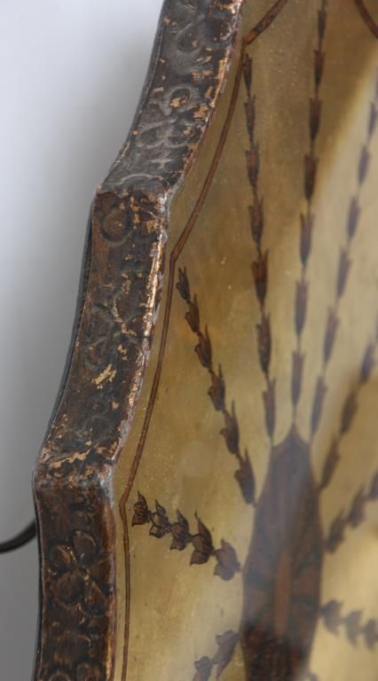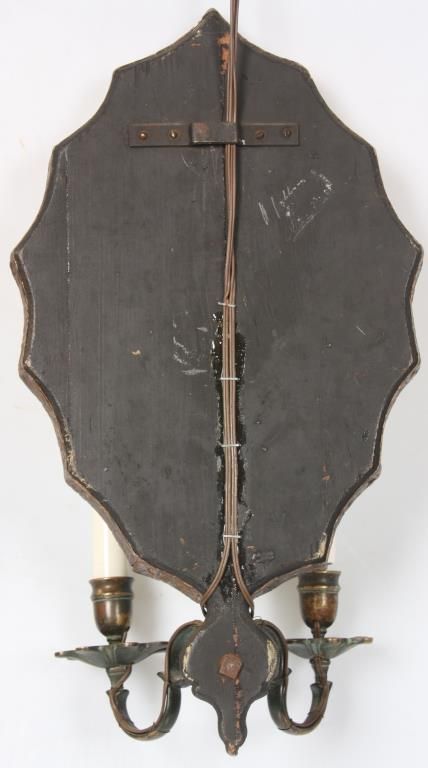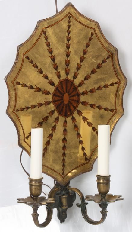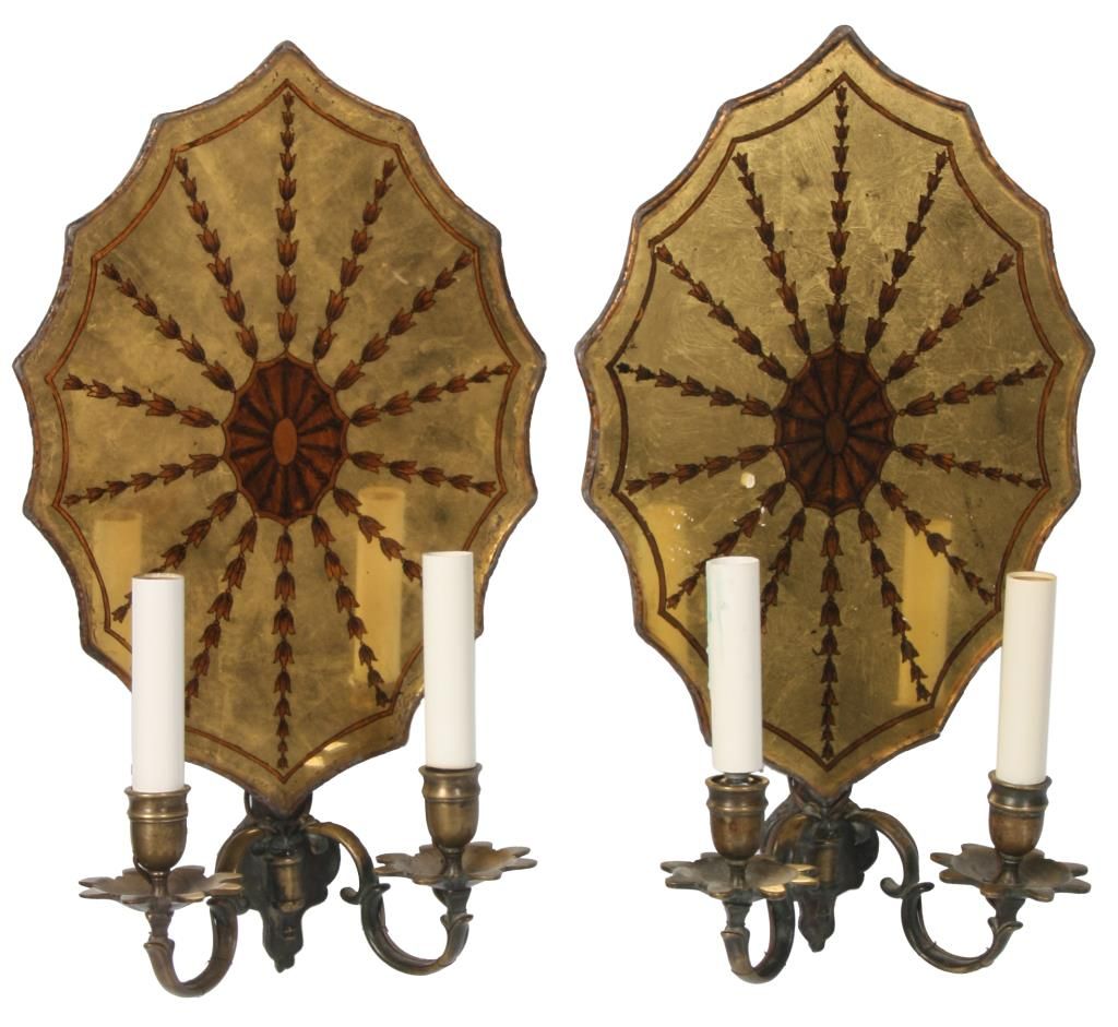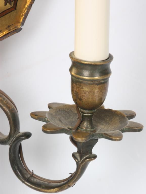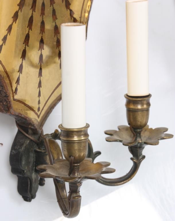 Pr. 2 Arm Wall Sconces. Reverse decorated glass back panel has a Sheraton style medallion and bell flower design on a mirrored gilt background, a wood paneled back with hand tooled brass trim around the edge; 2 brass candle arms with filigree design; electrified; in very good condition. 17 in. high x 9.75 in. wide x 6 in. deep.