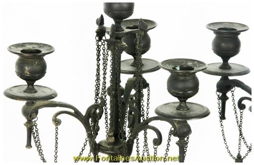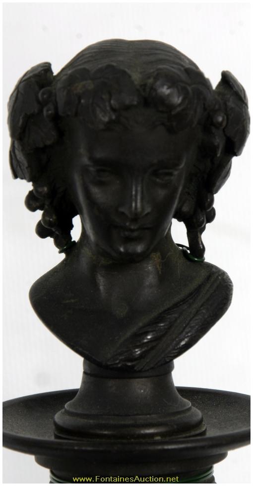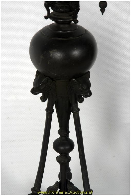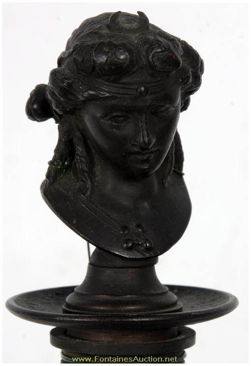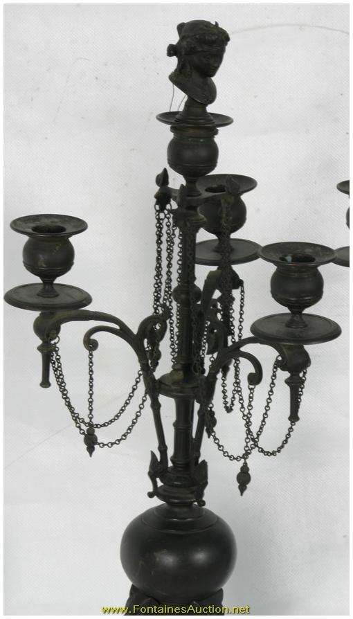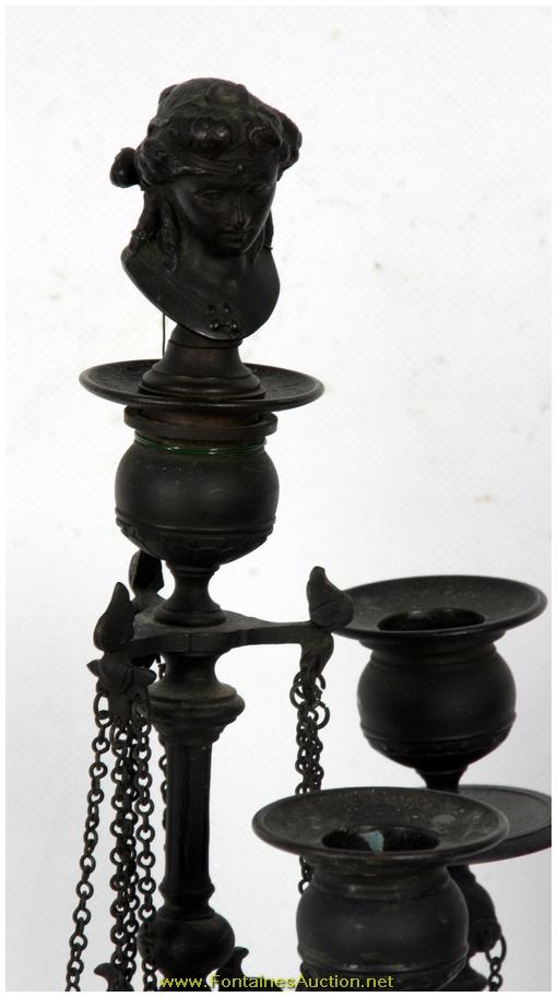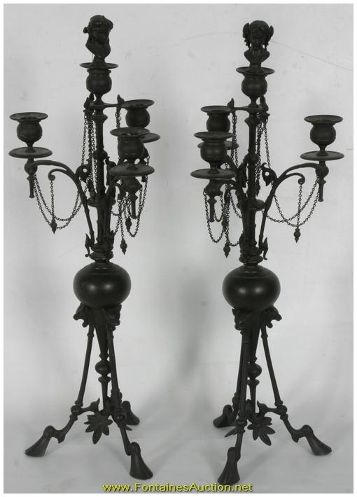 Pr Bronze Neo Greco Candelabra. Thin scrolling arms each mounted with a single bobeche; the stem continues up to a forth bobeche plugged with a removable bust of a Grecian woman. Below the stem is a bulbous section branching down to a tripod base with lion's heads at the base and hooved feet; complete with chains hanging between each of the arms. Excellent dark patina and in perfect condition. 9"W x 24"H. Estimated Value$1,500 - 2,500.