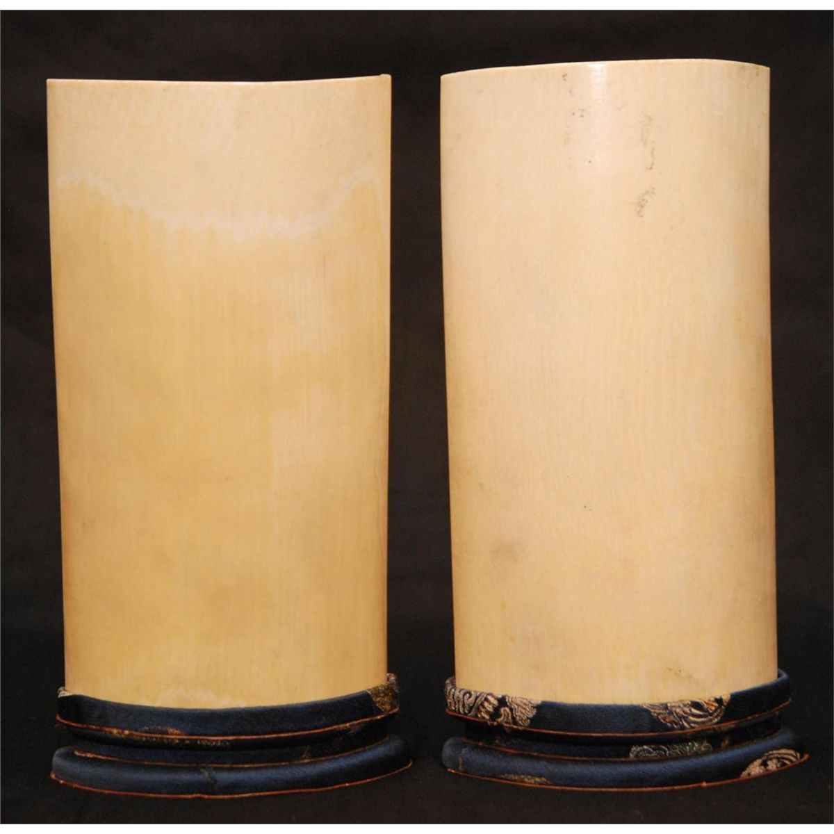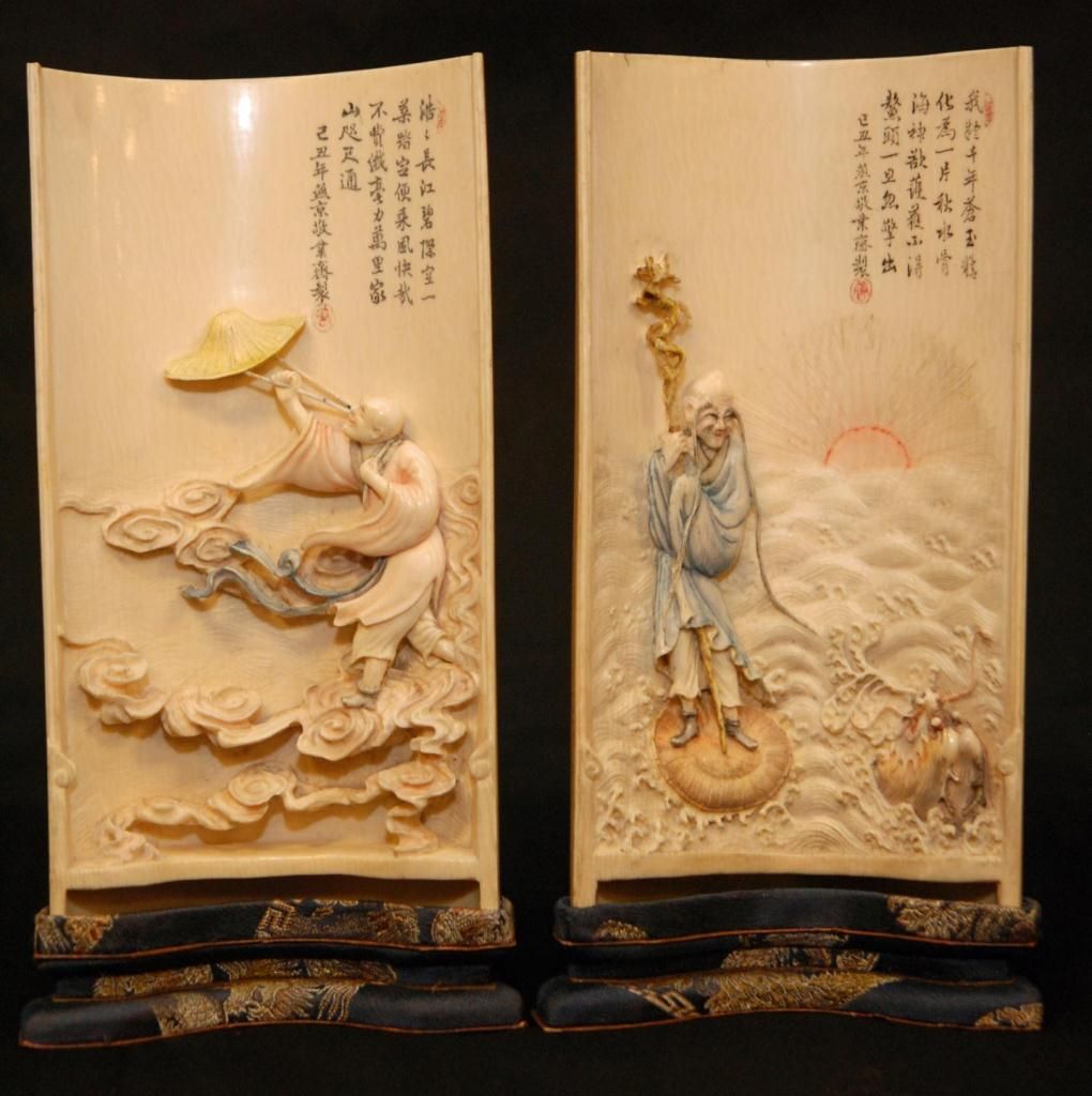 Pair of Chinese relief carved ivory four season scholar's desk wrist rest plaques. One depicting a man amongst clouds and wind with his hat being blown off of his head. The next depicting an immortal standing over water with dragon emerging from the waves. Each has etched calligraphy to upper right with red seals. Each carved with very fine detail. Late Qing to Republic period. Includes fitted silkbound stands. Each measures approx. 6 1/2" height x 3 1/2" width + 7/8" height (16.5cm x 8.9cm + 2.2cm). Total ivory weight of 420 grams.