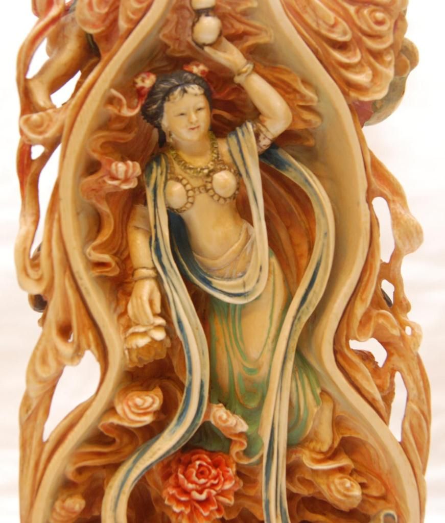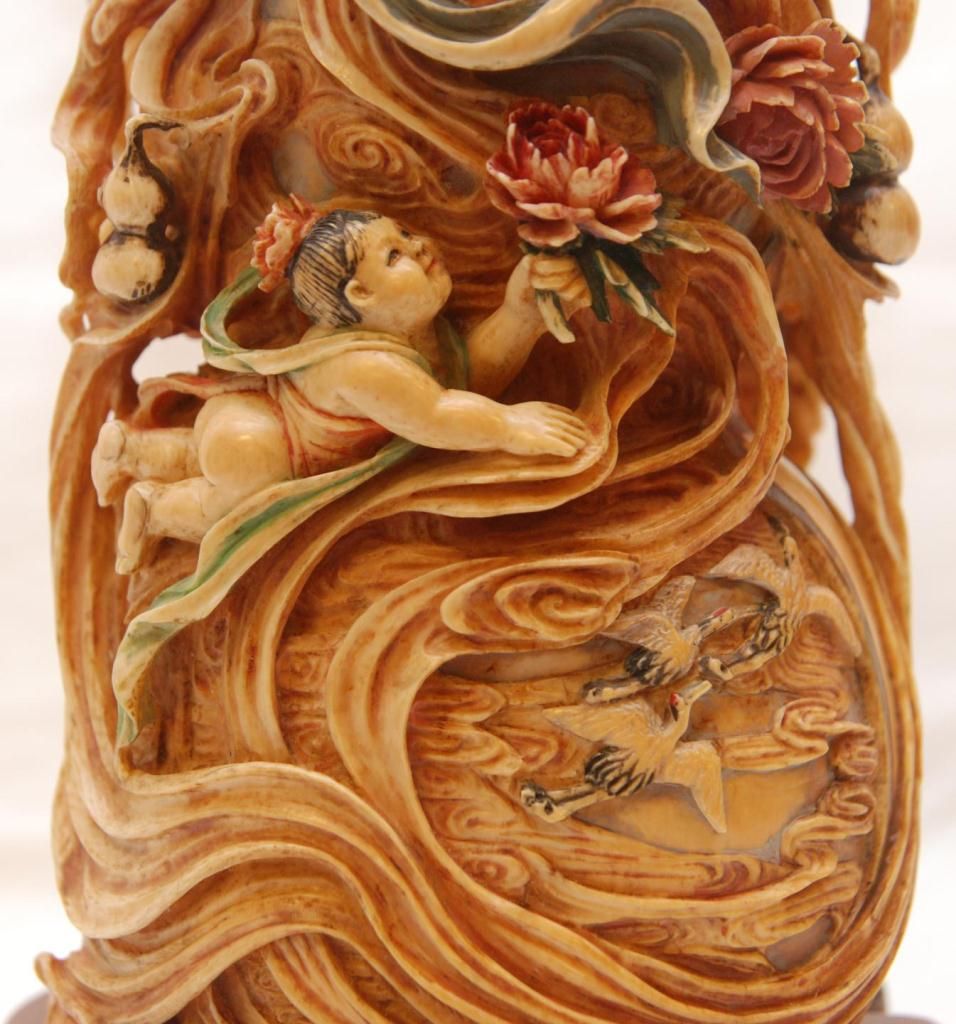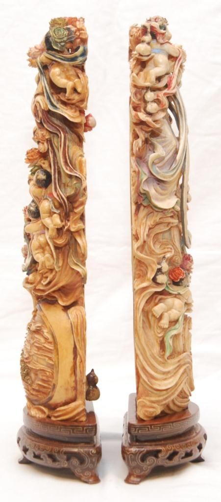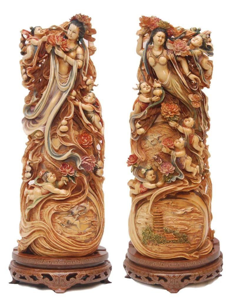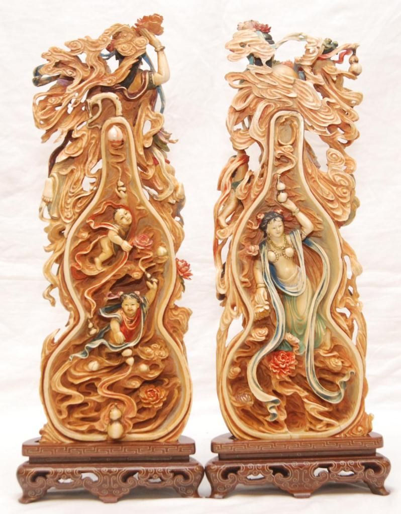 A pair of Chinese fully relief carved and polychromed interlocking ivory double gourd hulu form plaques. Most painstakingly carved from one tusk to form the two plaques. To outside each depicts Quan yin with flying attendants. All having flowing garments. Figural flower and cloud designs with storks and double gourds. One having a pagoda landscape scene. Inside depicts guan yin with flowers to one side the other depicting flying attendants with double gourds and lotus blossoms. Also has protruding peach and double gourd that inserts into it's mate. Includes fitted wooden silver inlay bases. Qing dynasty period (19th century). Also includes fitted presentation box. Each measures approx. 14" height x 5" width x 2" depth (35.5cm x 12.7cm x 5.1cm). Total ivory weight of 2795 grams.