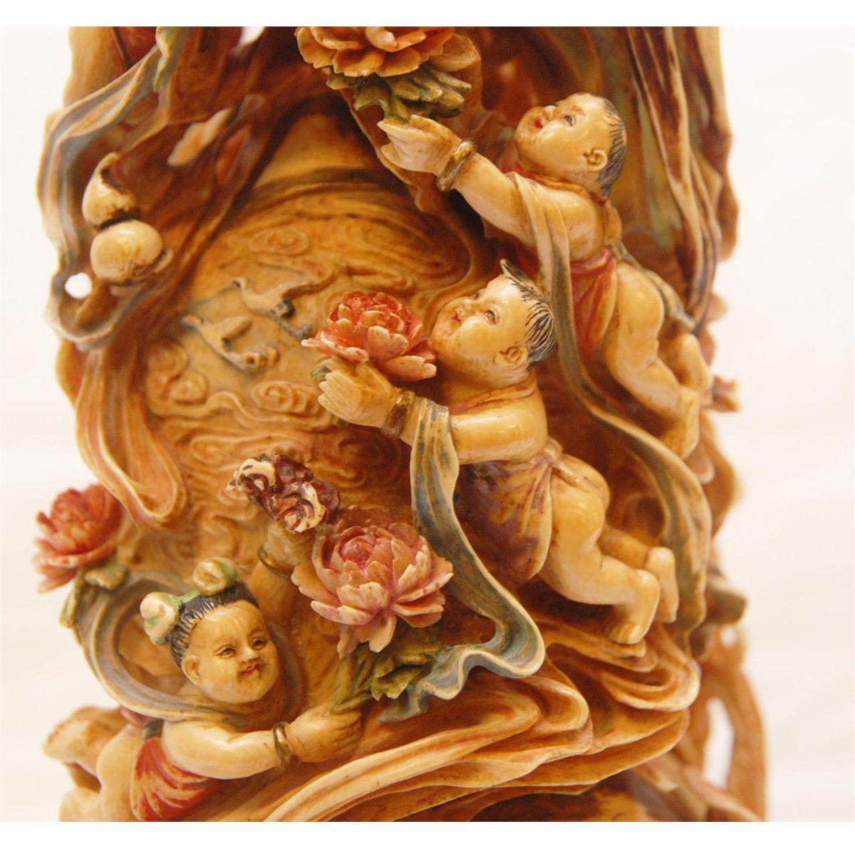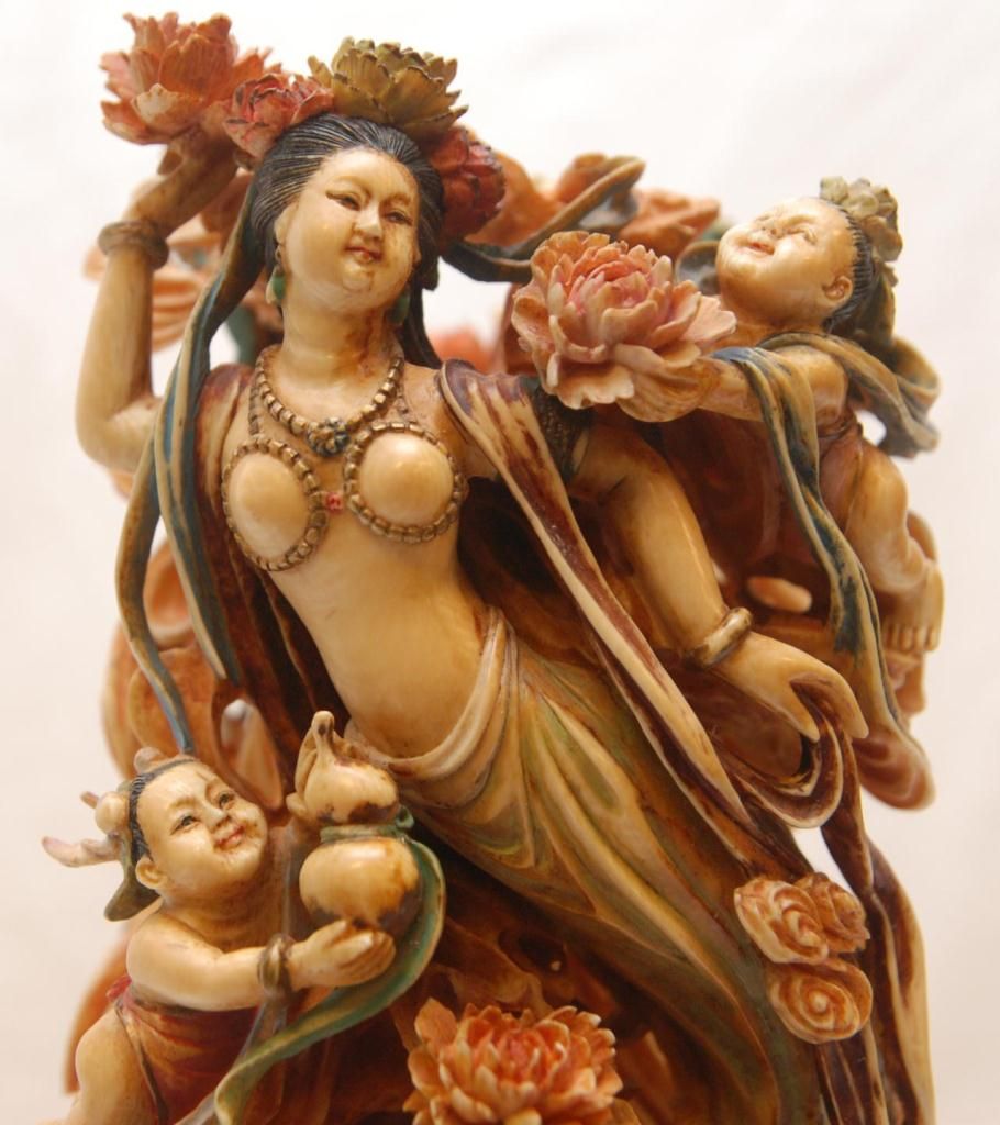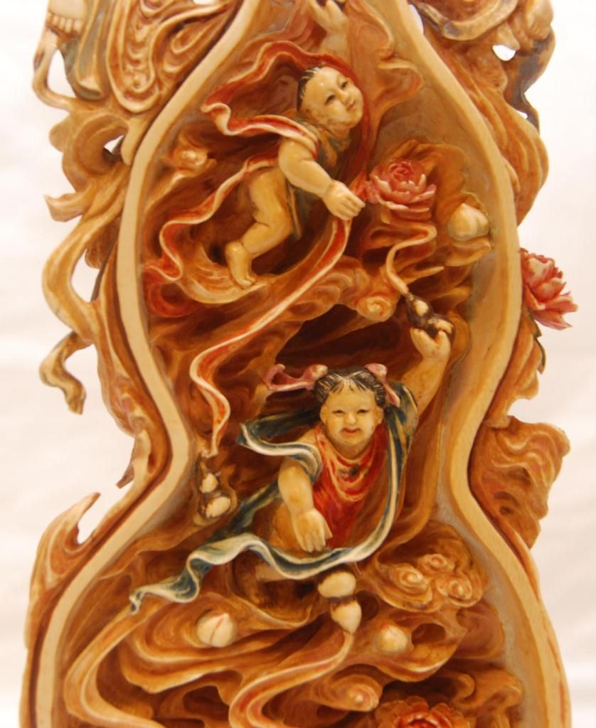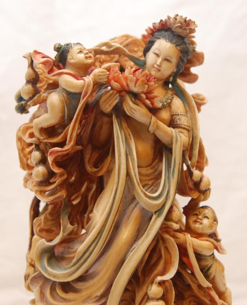 A pair of Chinese fully relief carved and polychromed interlocking ivory double gourd hulu form plaques. Most painstakingly carved from one tusk to form the two plaques. To outside each depicts Quan yin with flying attendants. All having flowing garments. Figural flower and cloud designs with storks and double gourds. One having a pagoda landscape scene. Inside depicts guan yin with flowers to one side the other depicting flying attendants with double gourds and lotus blossoms. Also has protruding peach and double gourd that inserts into it's mate. Includes fitted wooden silver inlay bases. Qing dynasty period (19th century). Also includes fitted presentation box. Each measures approx. 14" height x 5" width x 2" depth (35.5cm x 12.7cm x 5.1cm). Total ivory weight of 2795 grams.