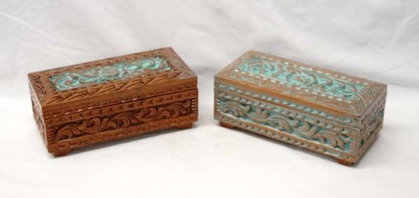 Pr Carved Wood Trinket Boxes, measure 3'' x 3.5'' x 8'', red velvet lined