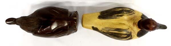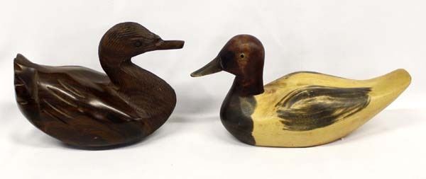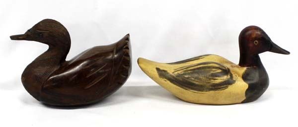 Pr Carved Wooden Ducks, largest measures 8x4x3''. One is carved Ironwood & the other one appears to be a light wood such as cottonwood