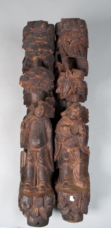 Each finely carved to depict standing figures under pine trees, the wood turning a dark patina from age, each 26"L, circa 18th-19th century.