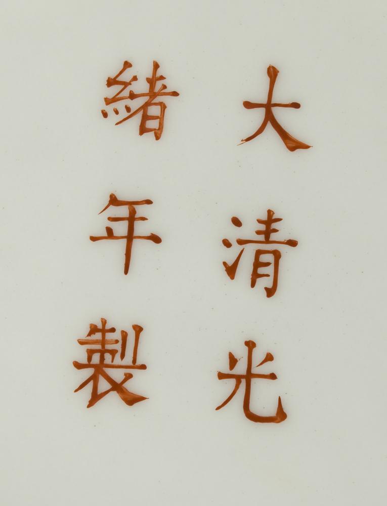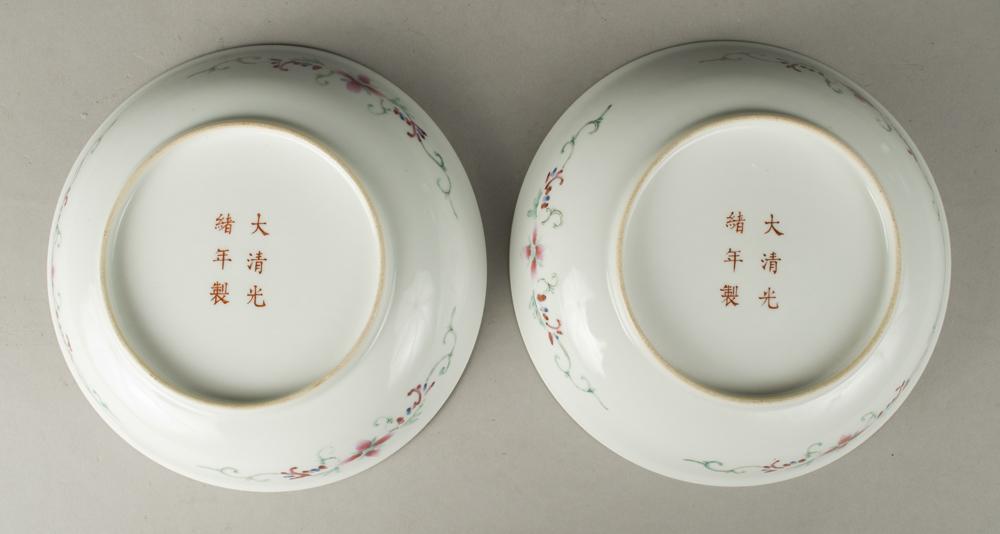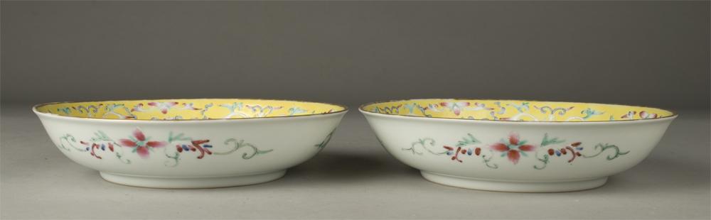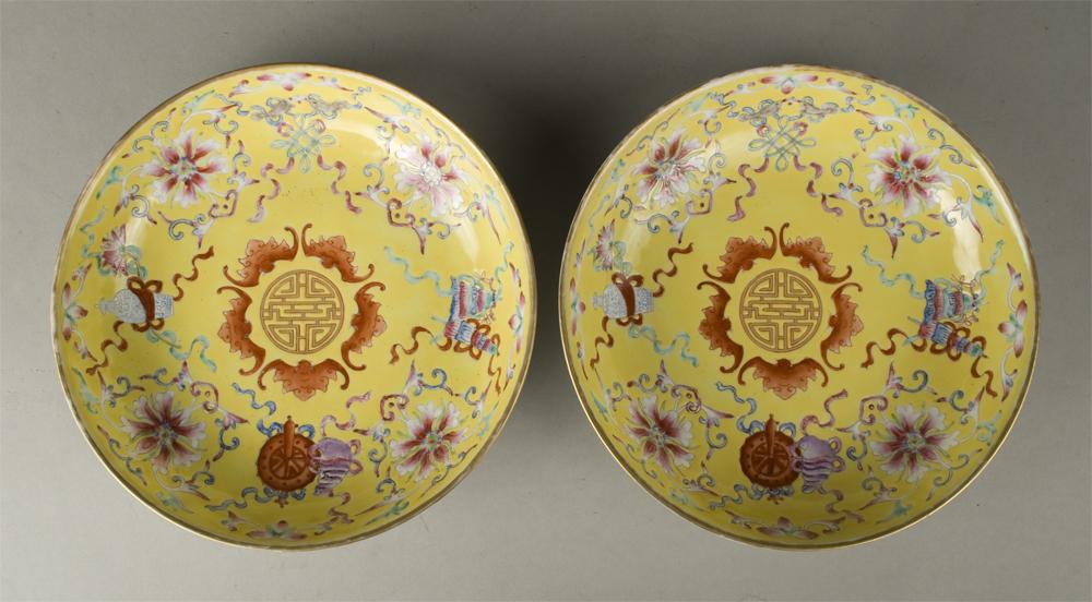 The bowls with a yellow ground, the sides painted with lotus flowers and antiques, the center with a shou symbol, surrounded by bats, the exterior white with three cartouches of flowers, each bears the six character Guangxu mark in iron red. 7"diameter and 1.5"H. Private collection Rochester Mi.