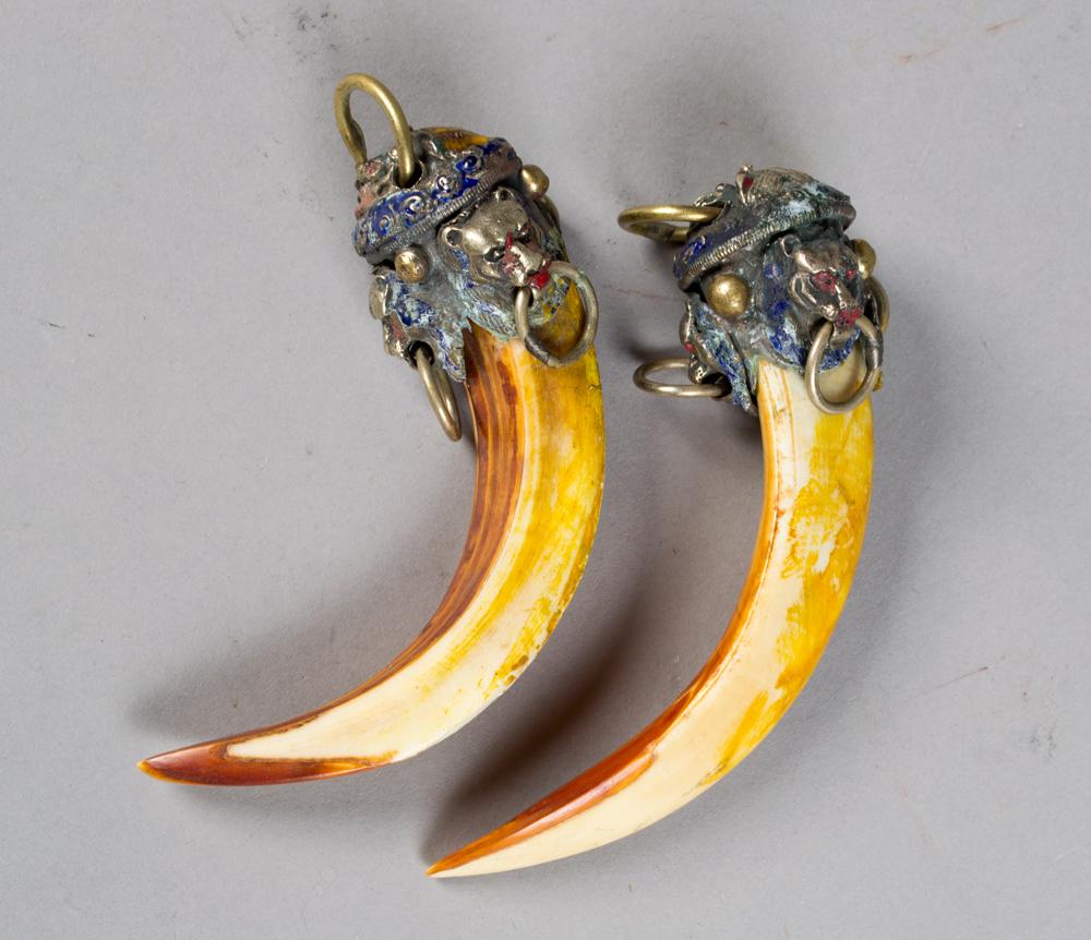finely molded to depict dragon heads enameled in reds, blues and yellows, 4.5"L circa 20th century.