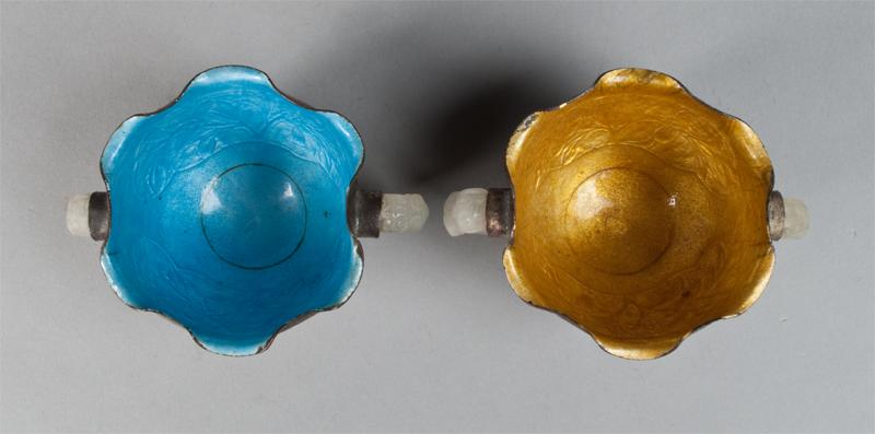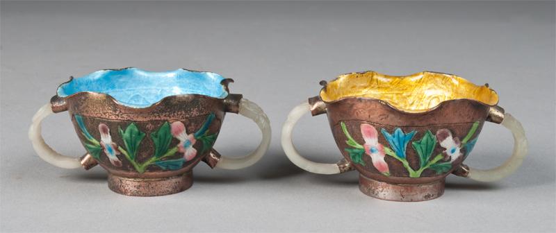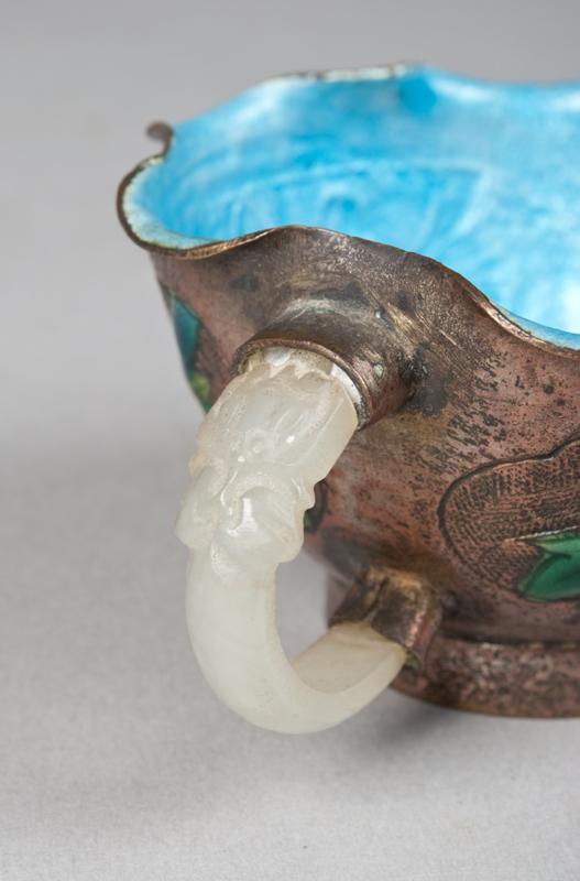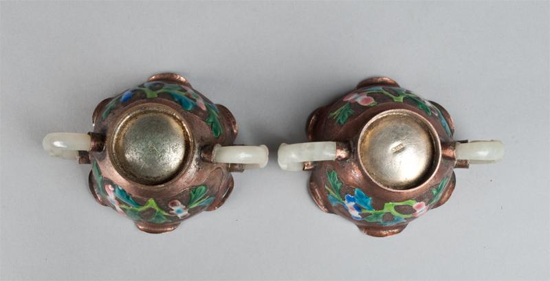 Both enameled on both sides to depict lotus flowers, the two handles in jade finely carved to depict the face of the beast, each measures 1.75"H x 3.5"W, circa late 19th-early 20th century