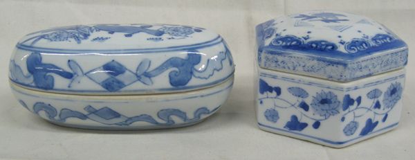 From the Proctor Collection a pair of Chinese Lidded Porcelain Trinket Boxes, blue and white. Largest measures 3''H x 6''L x 2.25''W. Some age.