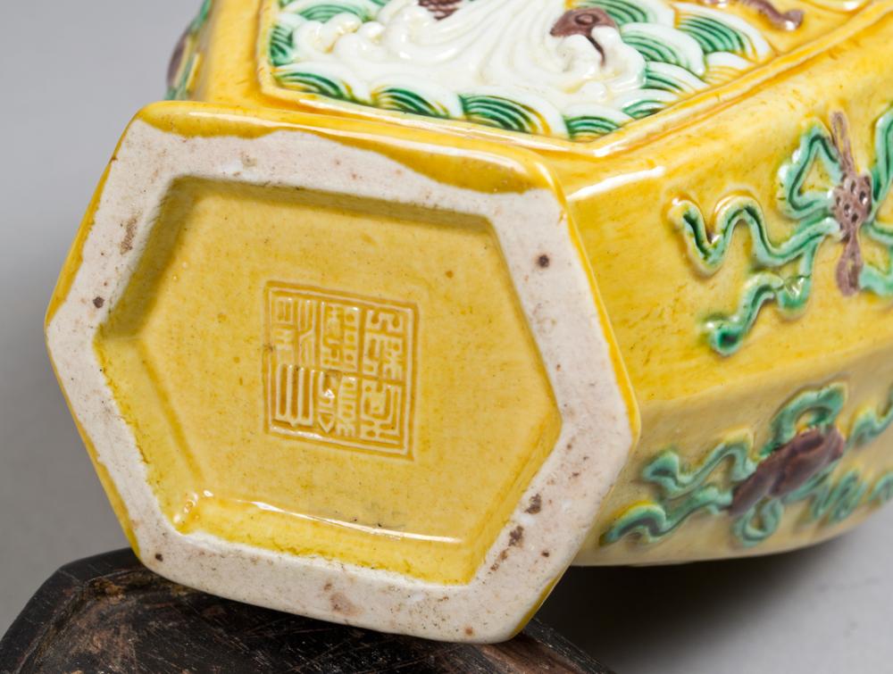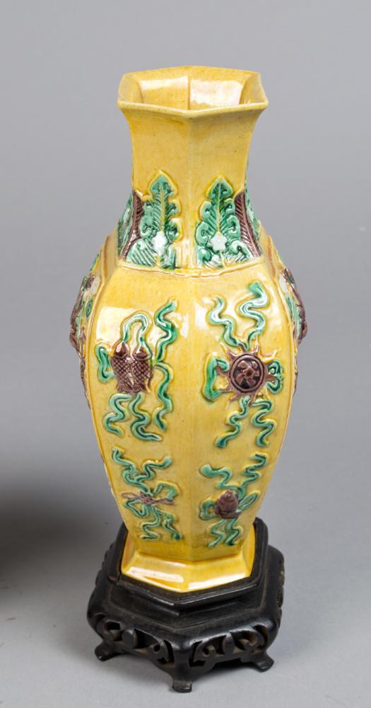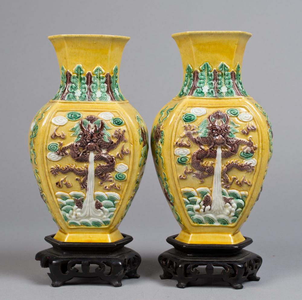 finely molded to depict dragons and ruyi clouds glazed in abergine green and white against a yellow ground each vase with impressed seal mark for Great Qing Qianlong Production, both with carved and fitted hardwood stands, 8"H not including the stands, circa 19th century.
