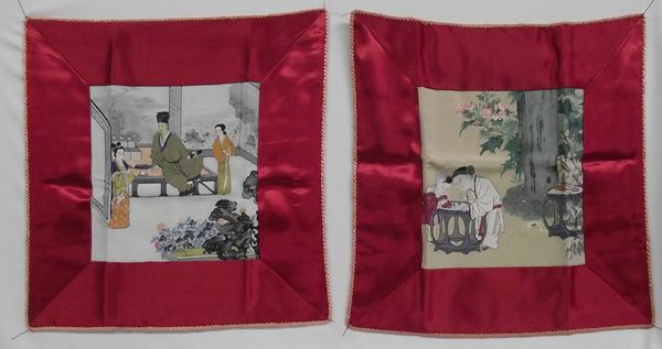 Acquired from New Mexico Estate comes a Pair of 1973 Chinese Rayon Tapestry Hand Painted Pillow Cases after 12th century renowned artst Su Han-Chin. From the painting called ''Children Playing in the Garden''. On the picture are also the seals of Emeror Chien Lung of the Ching Dynasty. Emperor Chien Lung wrote a poem to express his appreciation for the painting. Measures approx. 19'' x 19'' and comes in original Box with informational sheet in both English & Chinese.