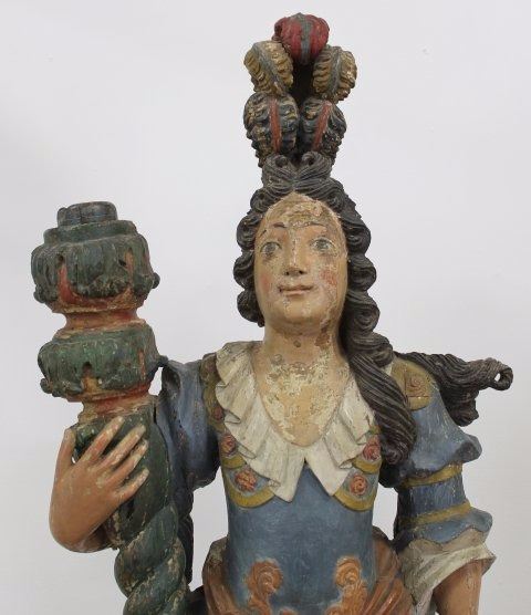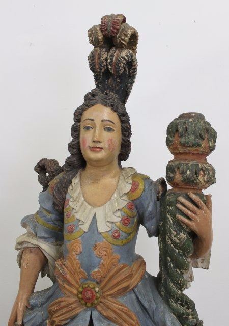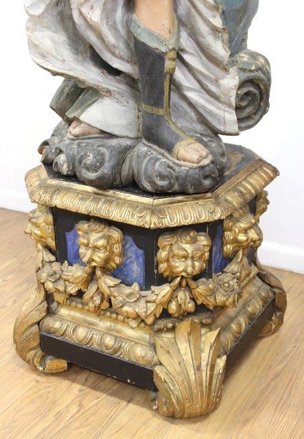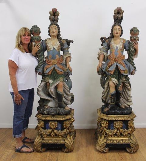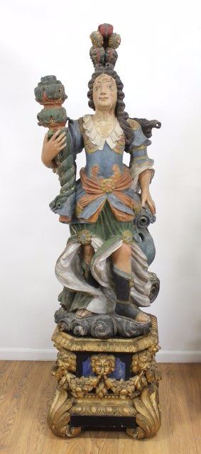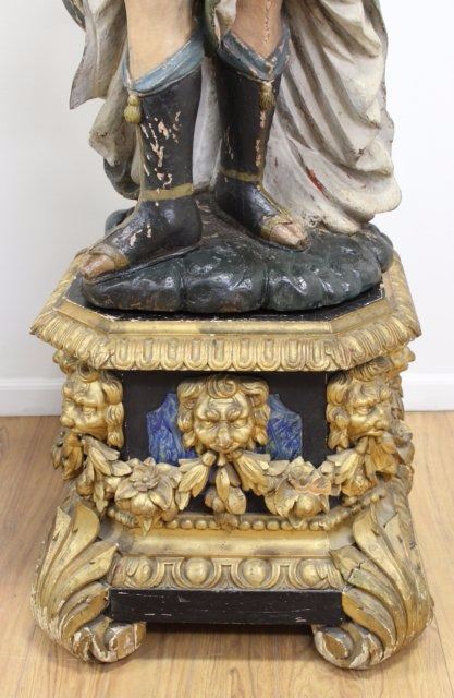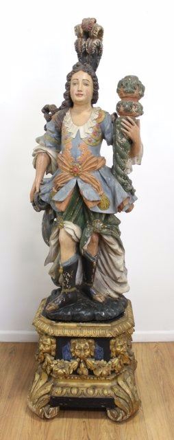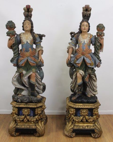 Late 18th/early 19th century. On pedestals. Figures approx. 59 1/2" H. Pedestals approx. 20 1/2" H. Overall 80" H. (6165) Some refreshing to paint and chips to original paint.