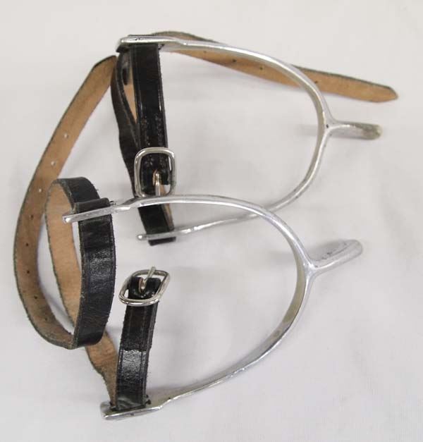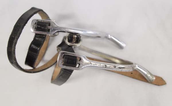Pr English Blunt End Spurs, measures 3.25''W at heel, leather straps